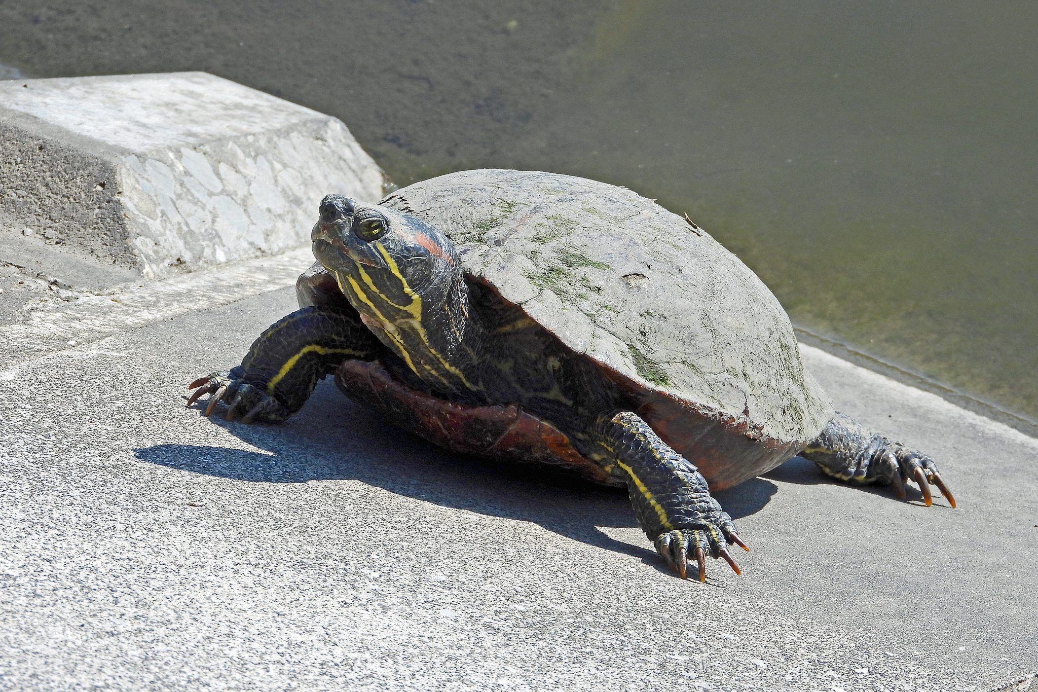 いつもの所に「ミシシッピアカミミガメ」が、逃げずにじっとしてました。