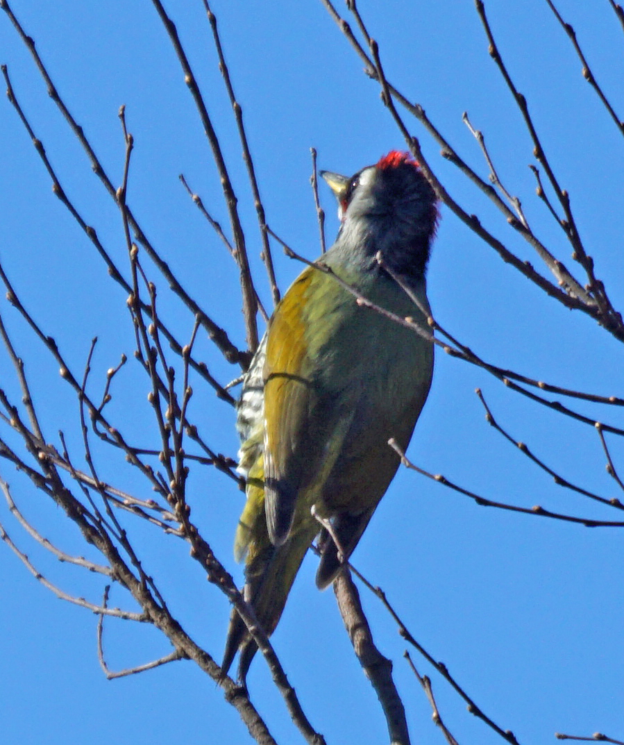 今日見かけたアオゲラ。 幹ではなく、高い枝先に居て、枝と一緒に風にユラユラ。