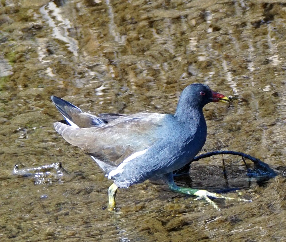良く見える所にバンが1羽。 川の浅い所を勢いよく走っては、さかんに何やらちいさなものを食べていました。 ずいぶん動きの活発なバンでした。
