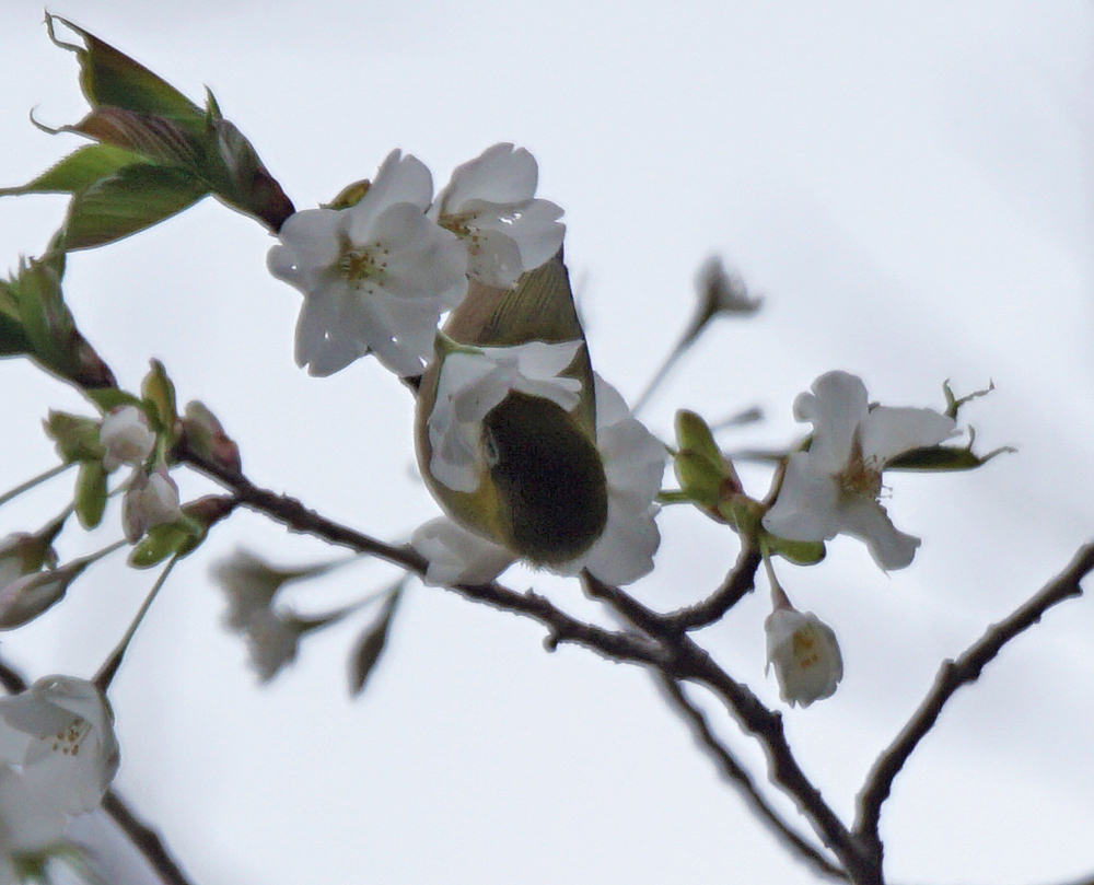 メジロが数羽、高い枝で吸蜜