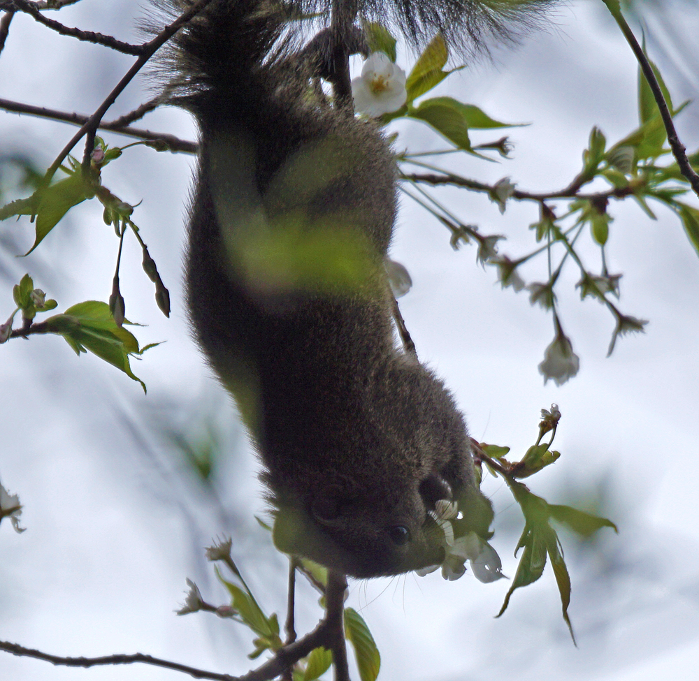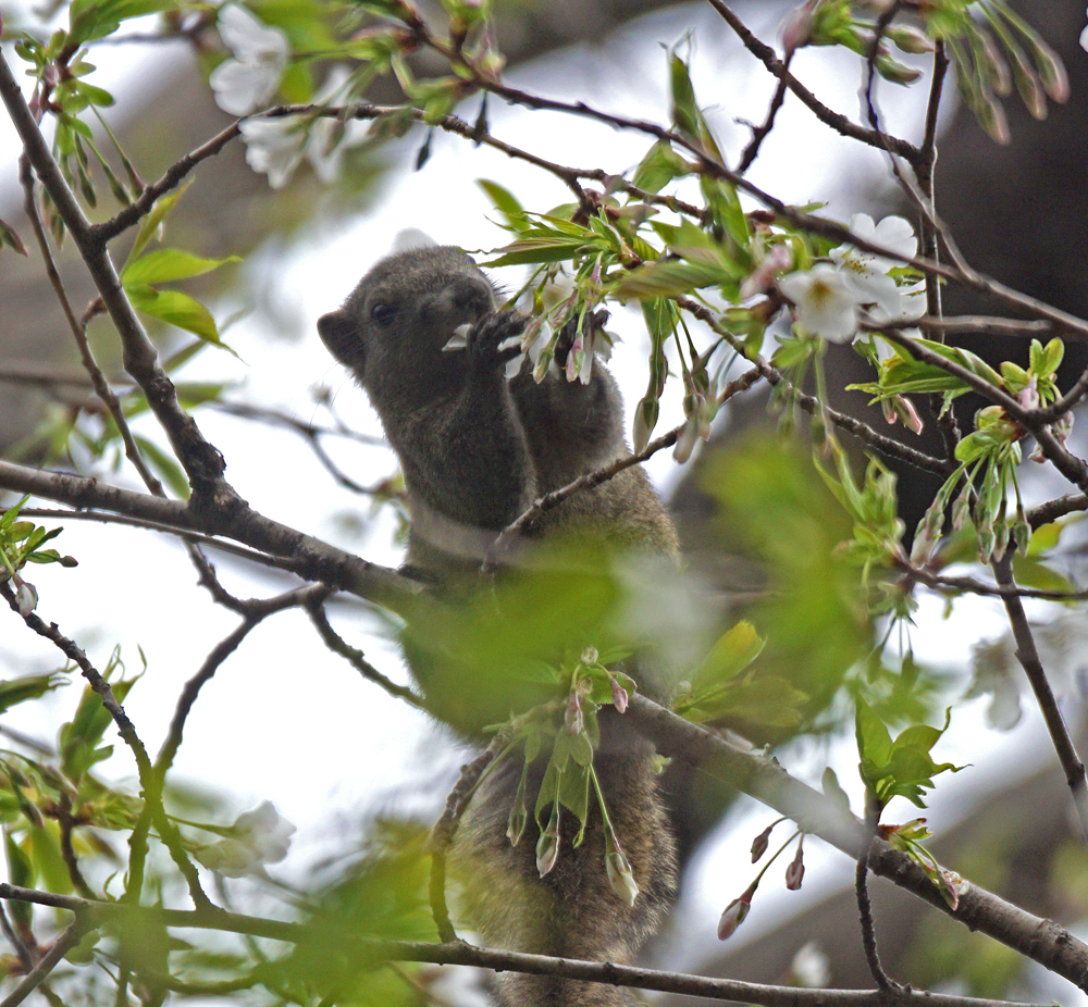 低い所に何か大きいなのが、と思ったら、タイワンリスでした。 前足で花をつかむように食べていてビックリ。 リスがサクラの花を食べるのは初めてみました。