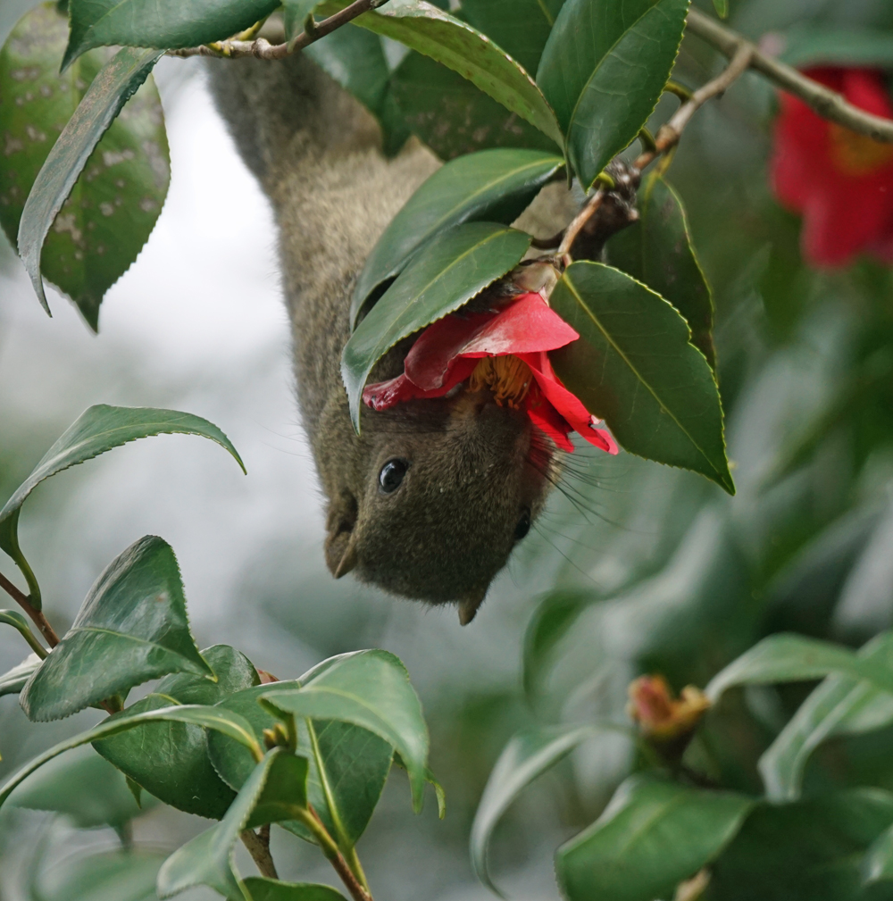 リスはヤブツバキの花にも。こちらは、花に顔を入れるようにして、蜜をなめていました。
