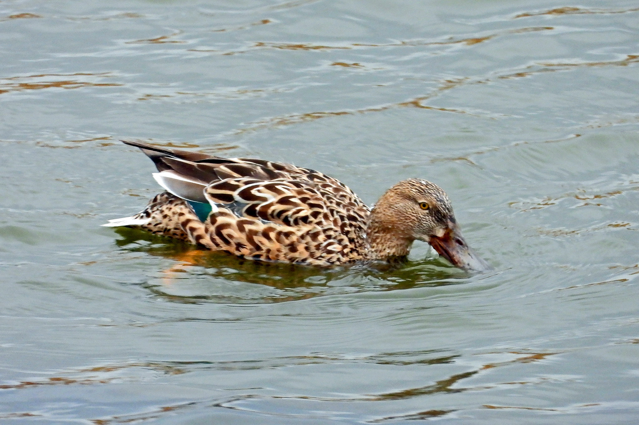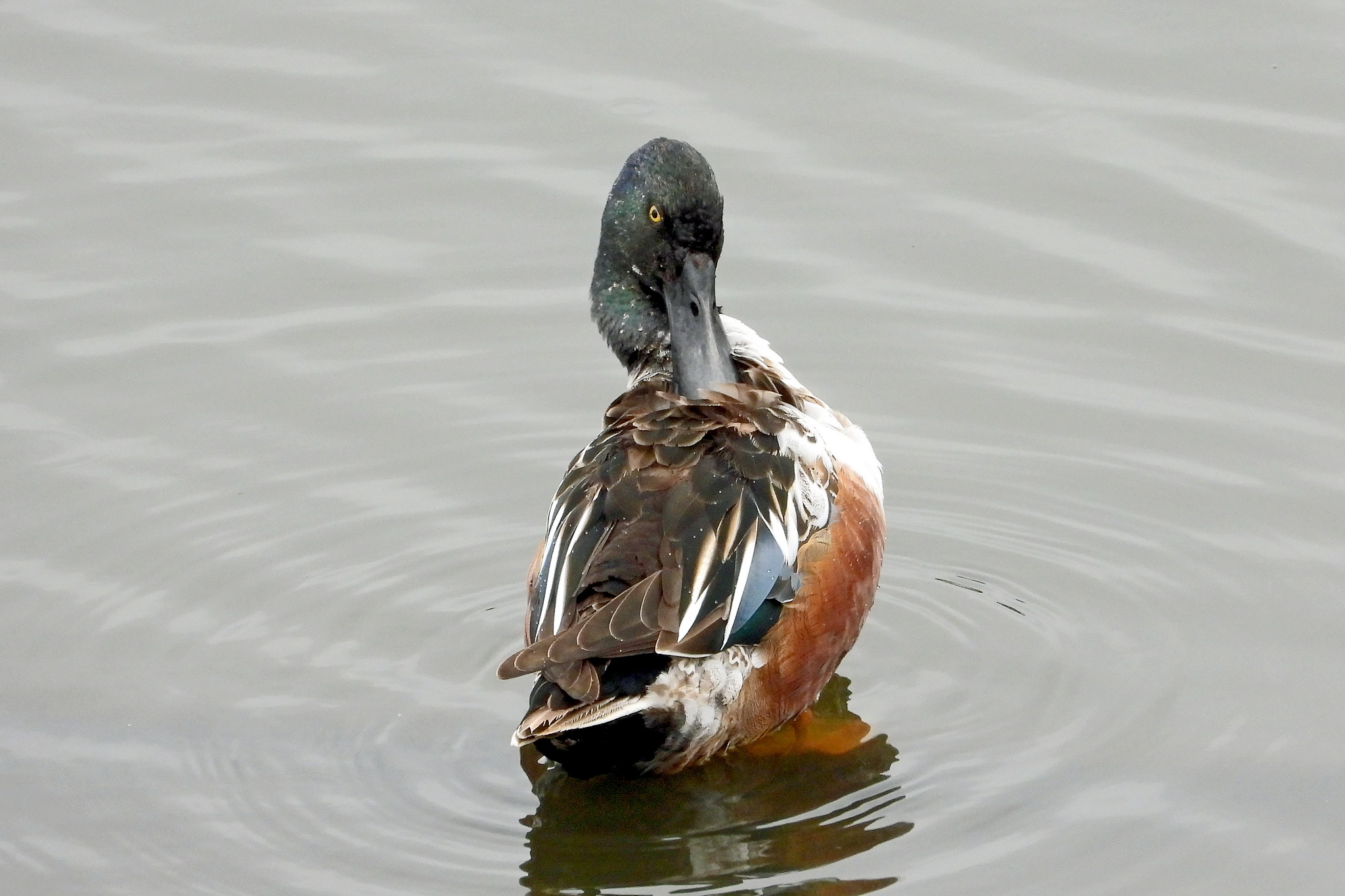 「ハシビロガモ」のオスが四羽にメスが二羽居ました。