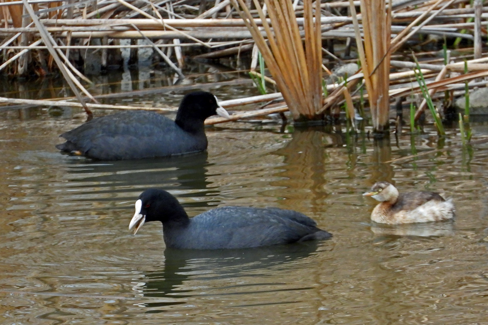 食事中の「オオバン」の所に「カイツブリ」が通りかかりました。