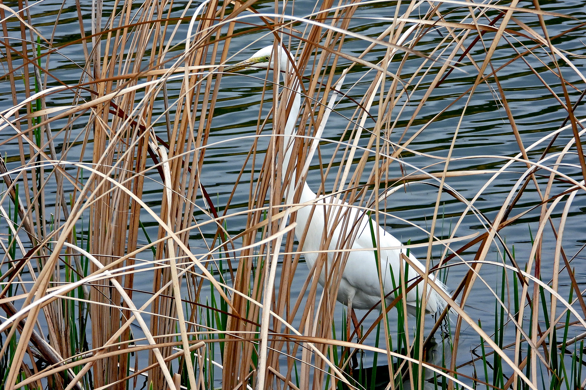 葦の向こうに居るのは「ダイサギ」ですね。