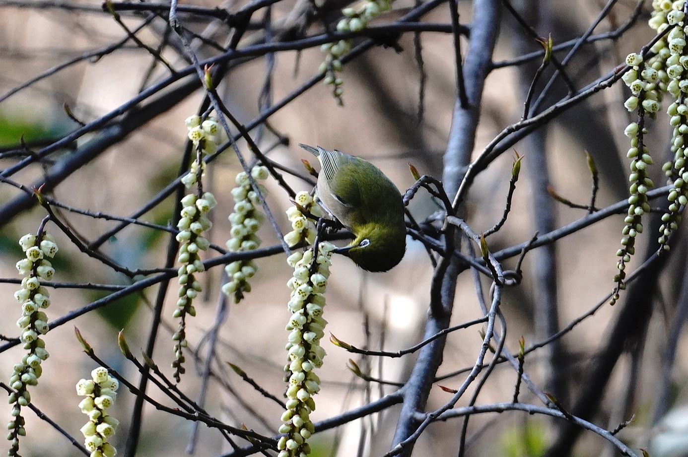 朝一番最初に目にしたのは、キブシに群れでいたメジロでした