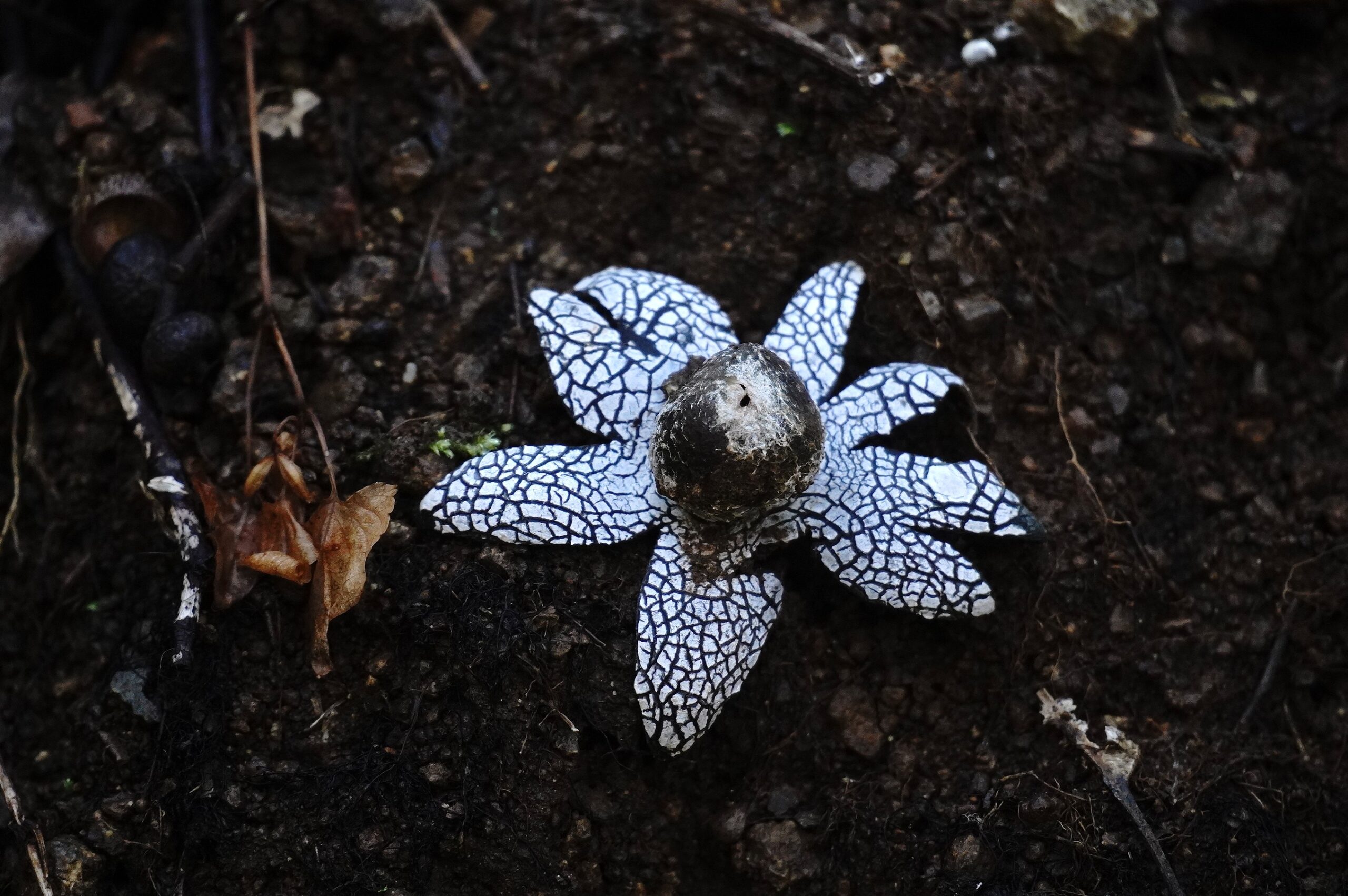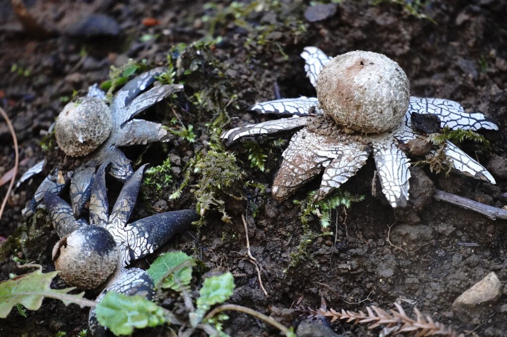 ツチグリ 晩夏から秋にかけて発生 成熟すると外皮が8から10個の星形に広がり、雨に当たるとこのような形状で開くそうで、別名「星の湿度計」というロマンティックな別名があるそうです