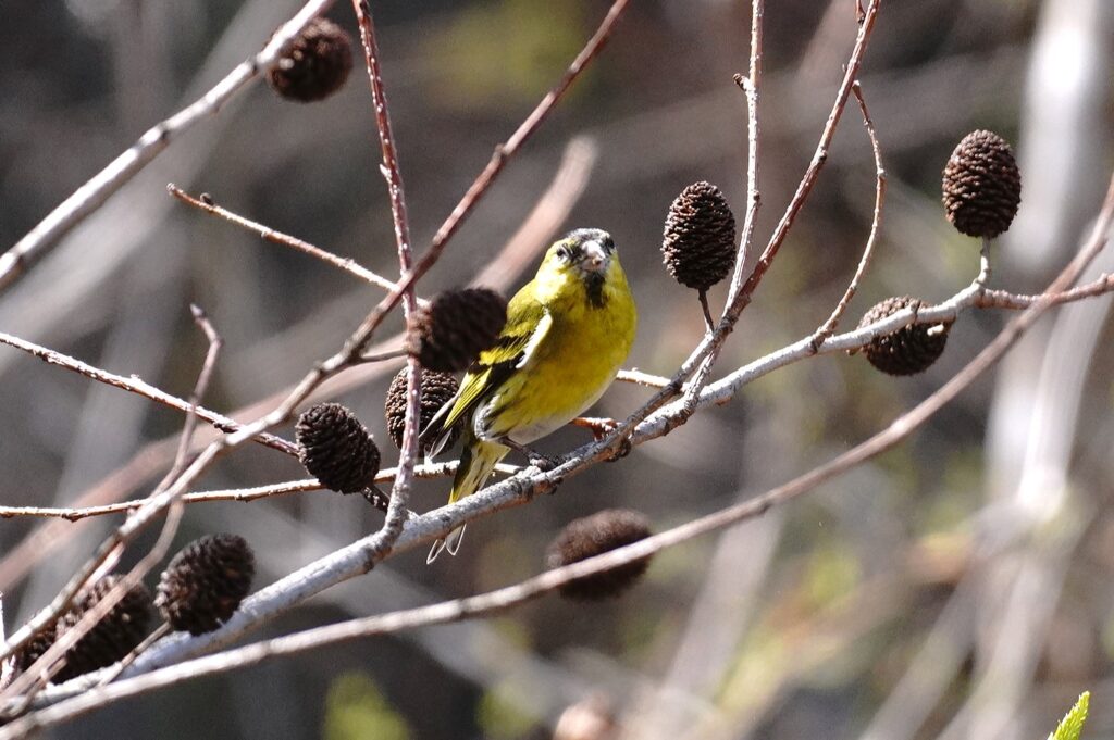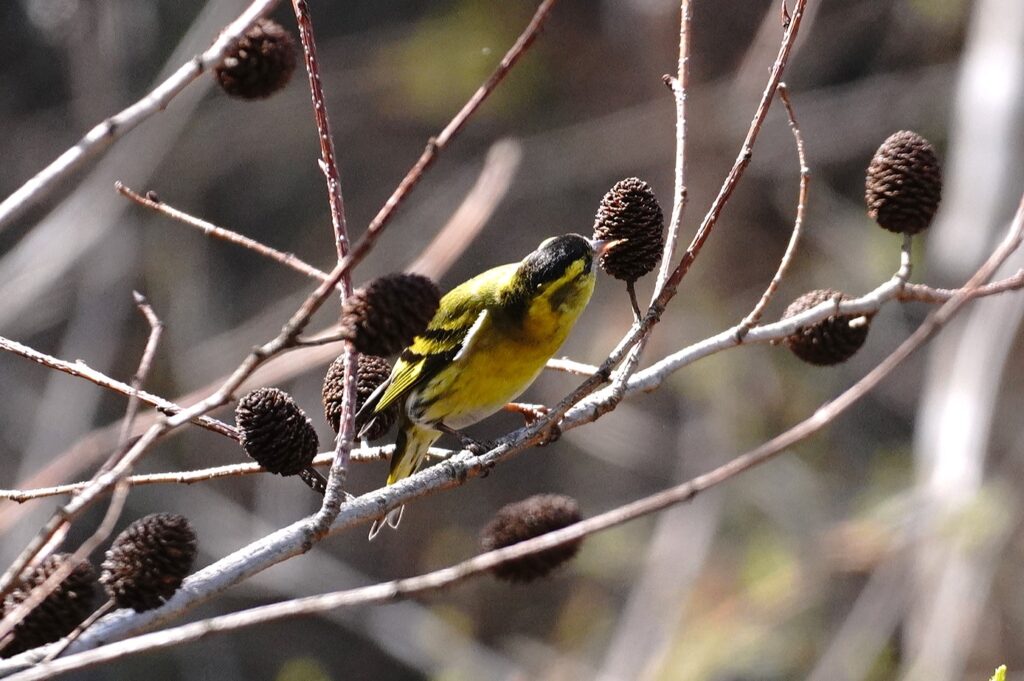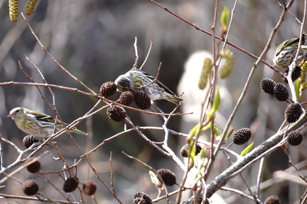 マヒワ♂ 冬鳥 マヒワの群れがハンノキで採餌