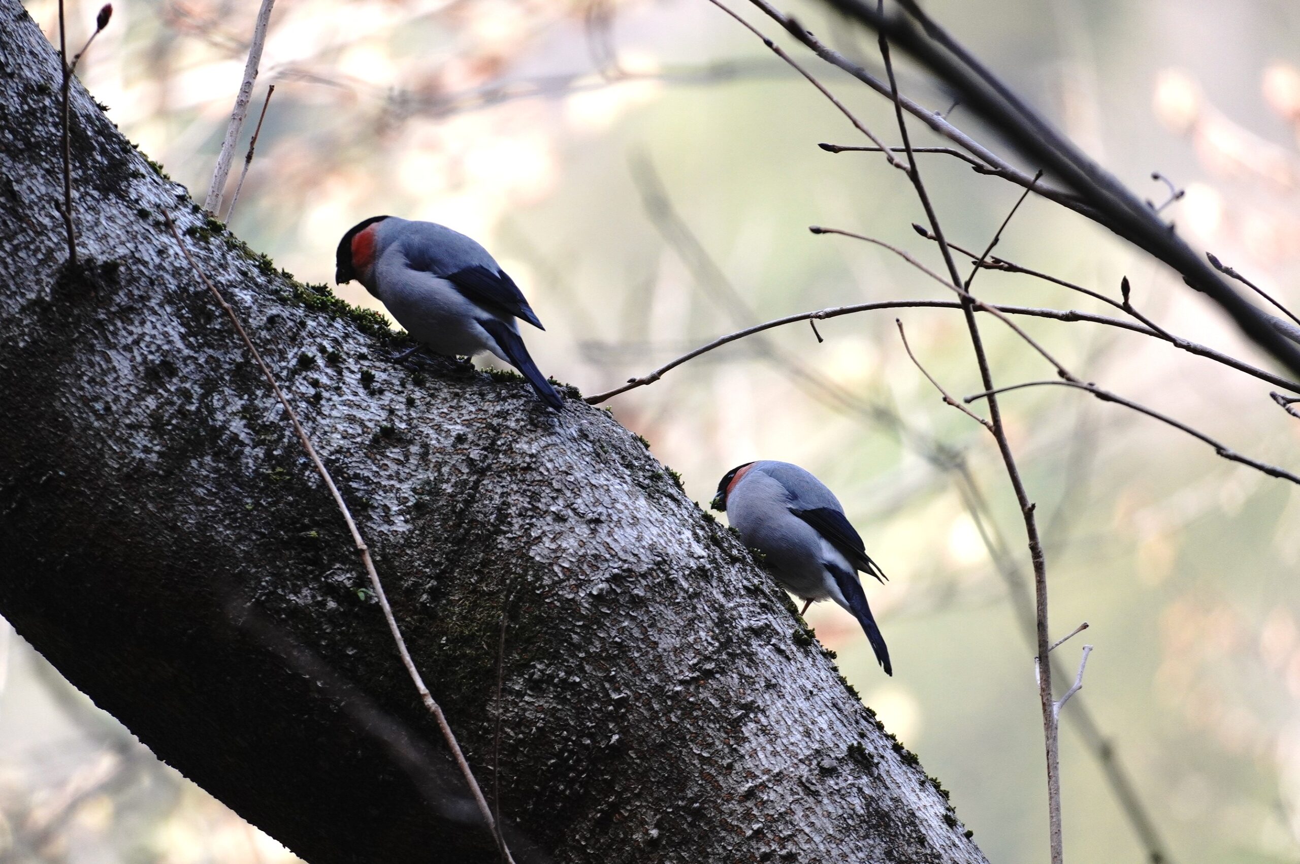 ウソ兄弟?仲良く止まって、樹皮についた苔を食べていました