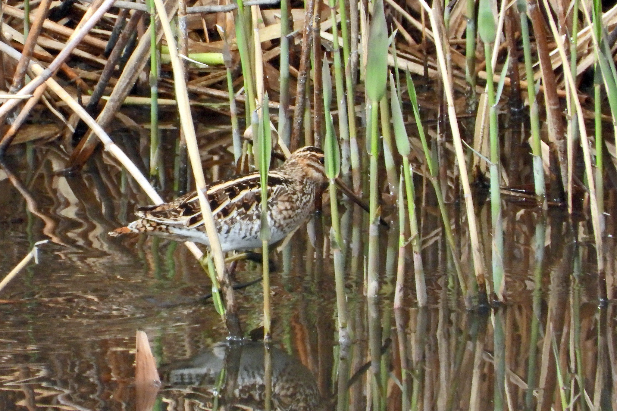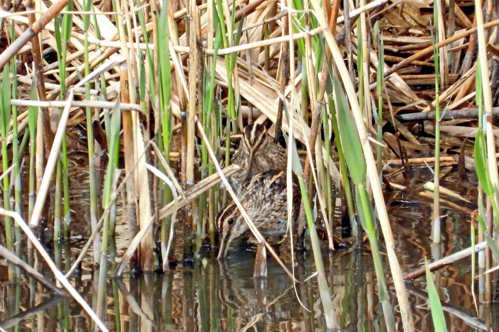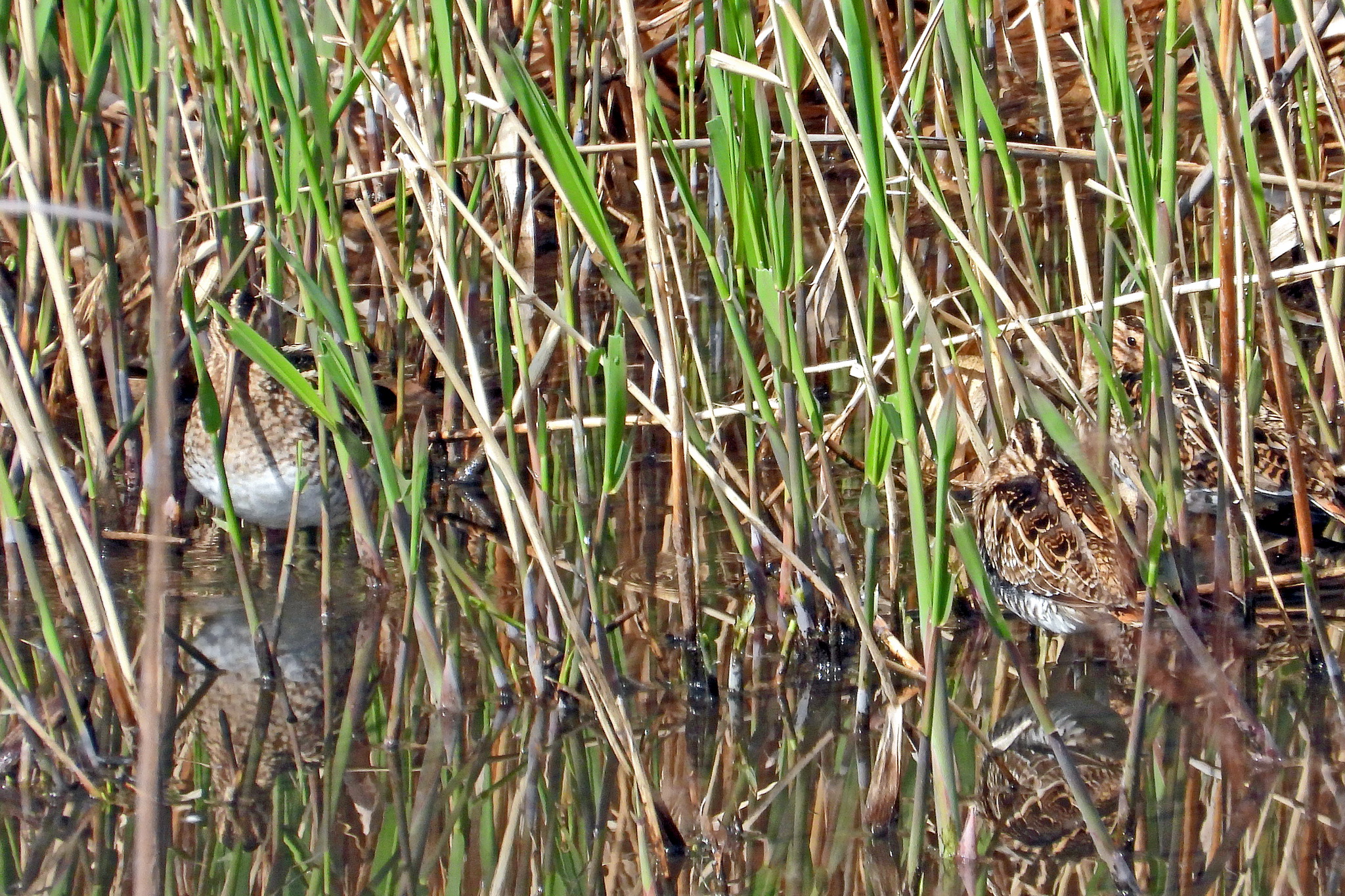 葦原の根本付近に「タシギ」が点々と居ますね。
