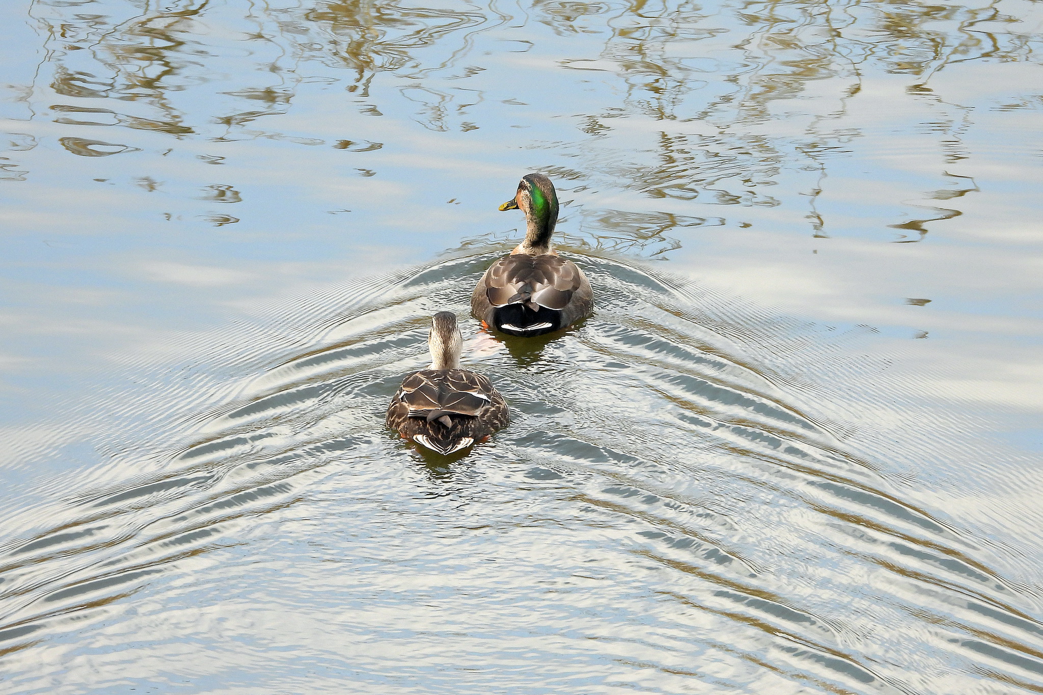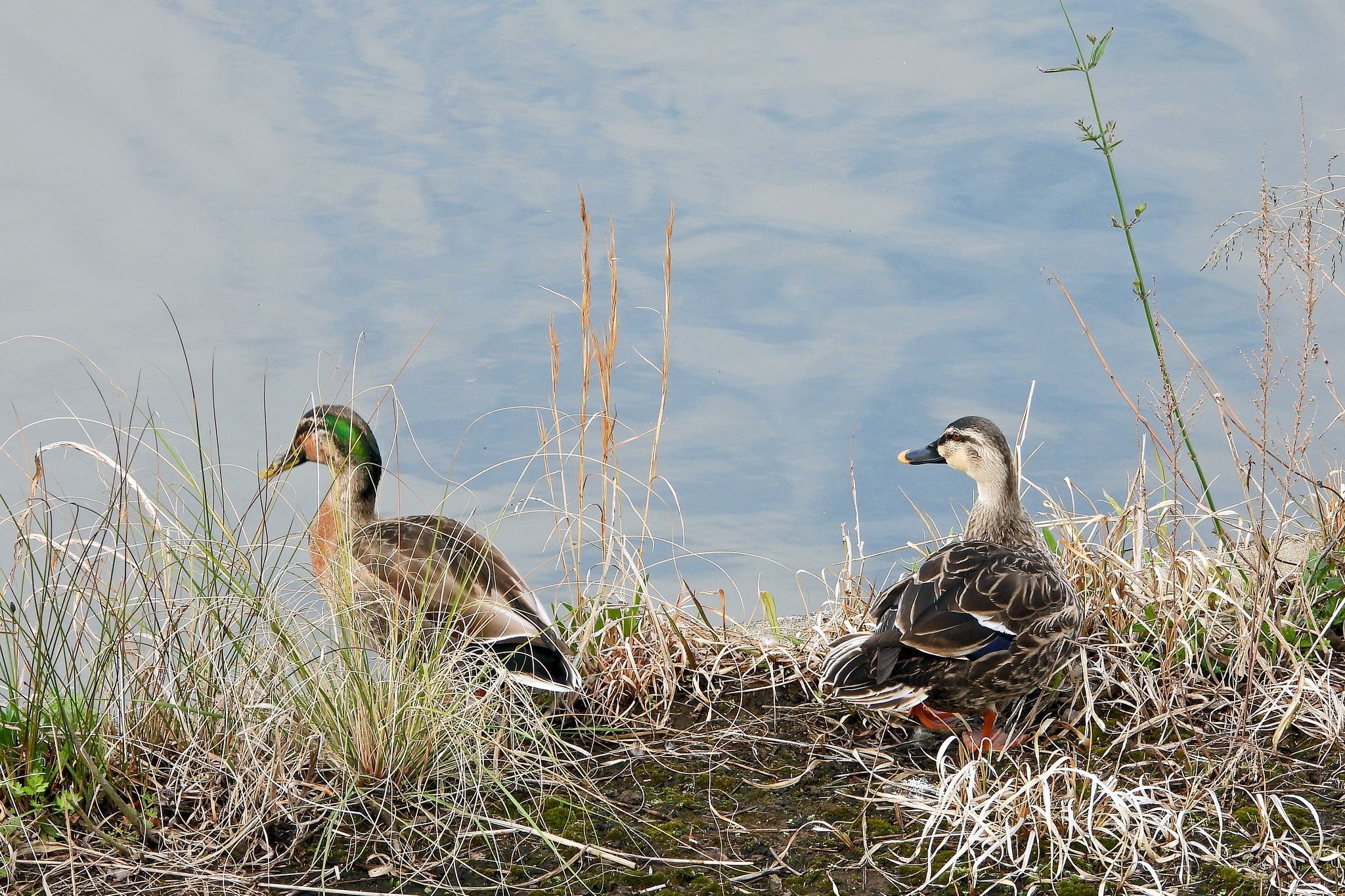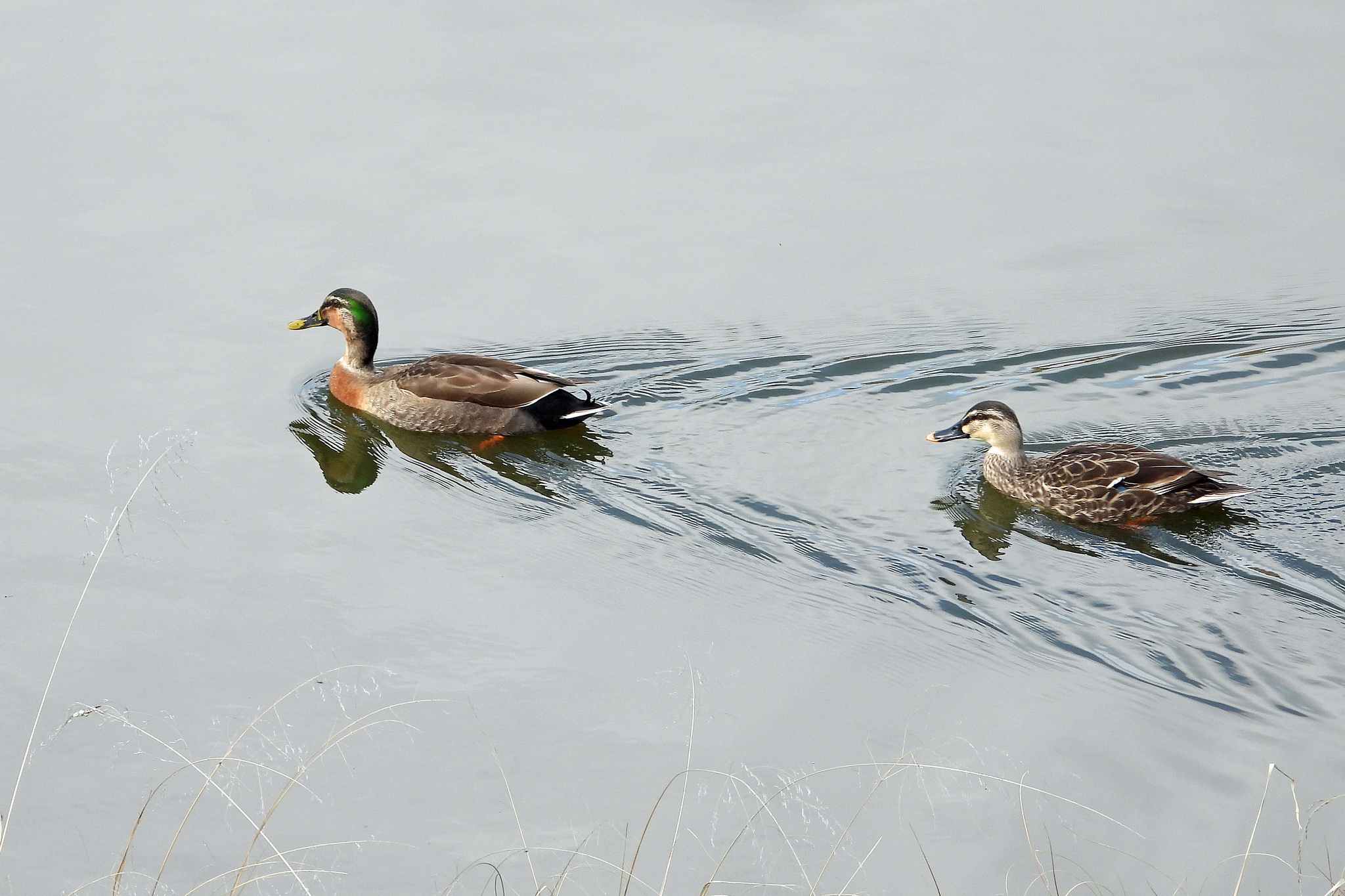 おっ、向こう岸で交雑種の「マガモ」カップルが、