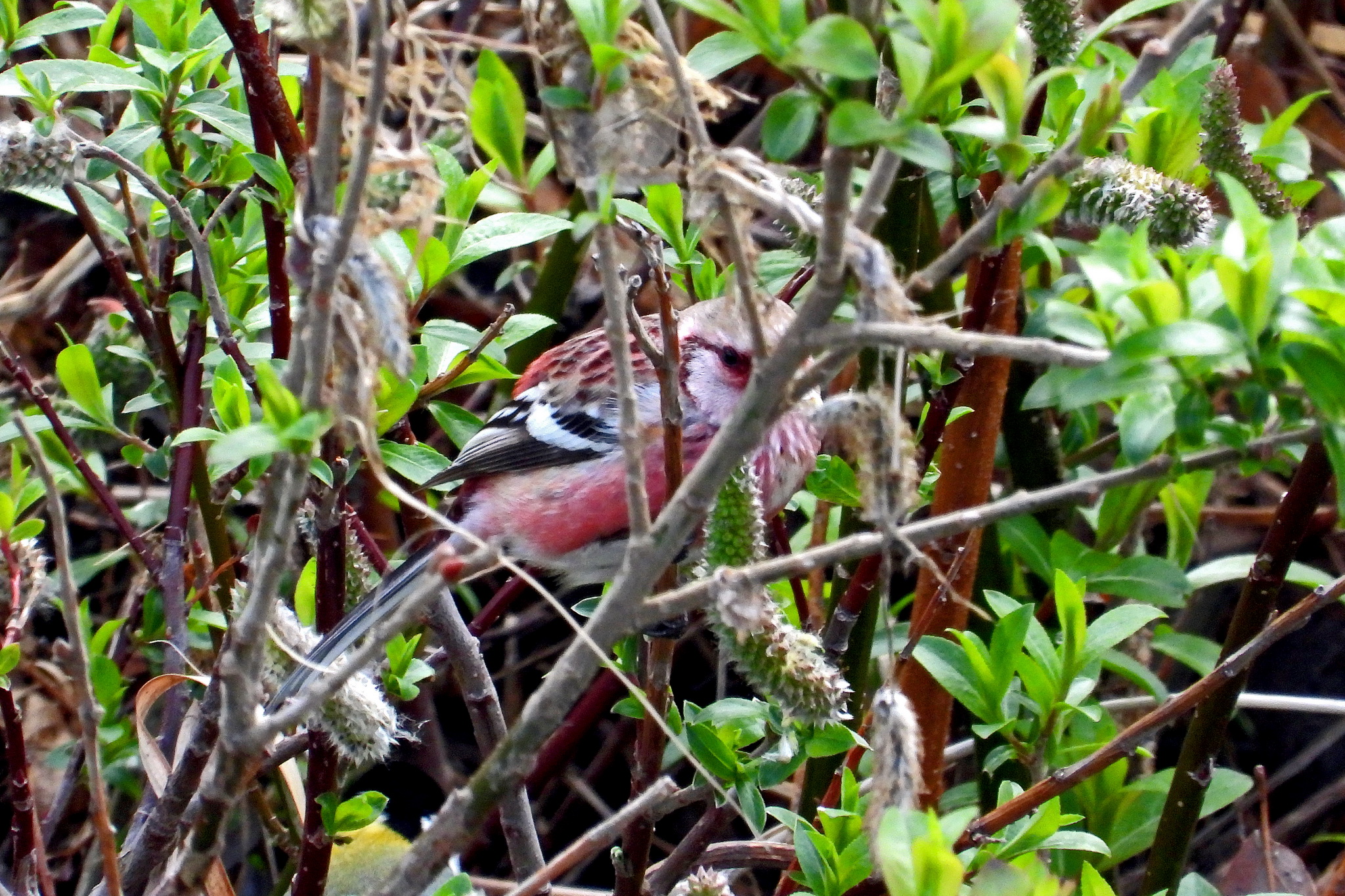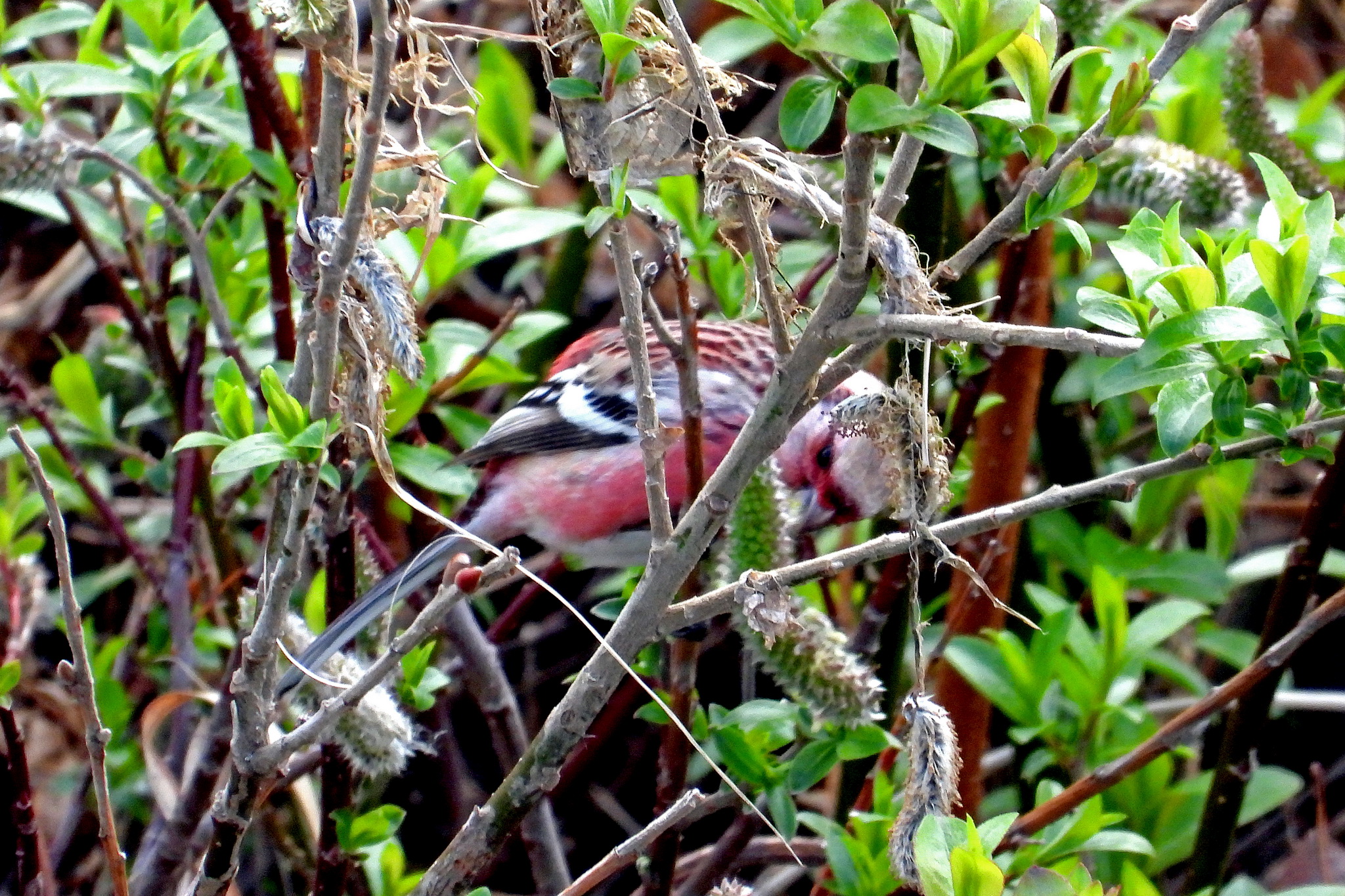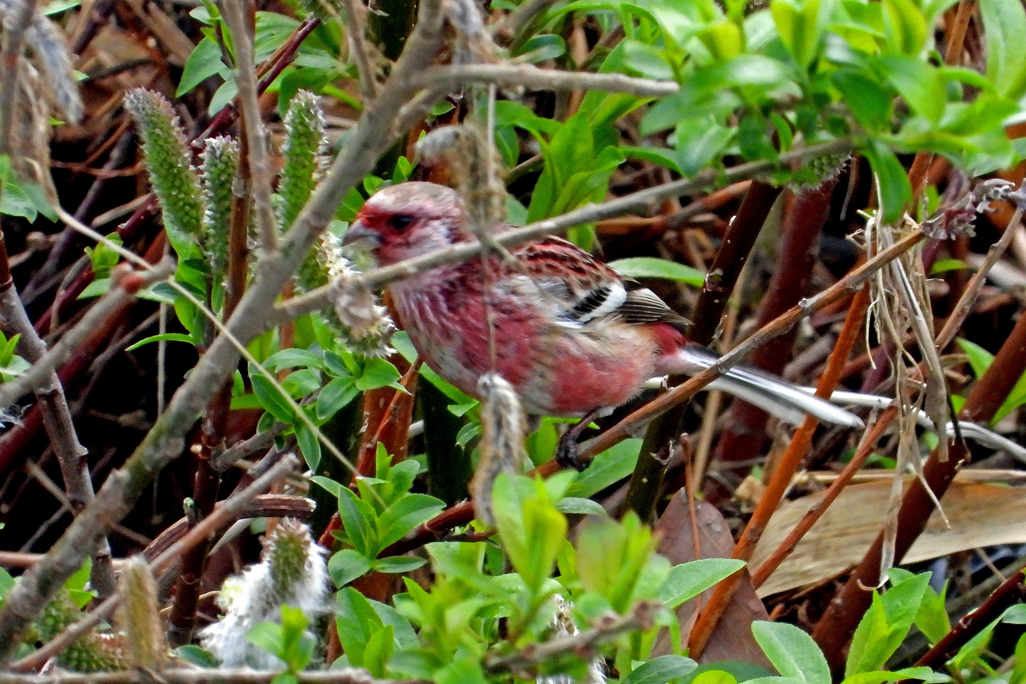 あそこに「ベニマシコ」のオスとメスが居るとのこと。