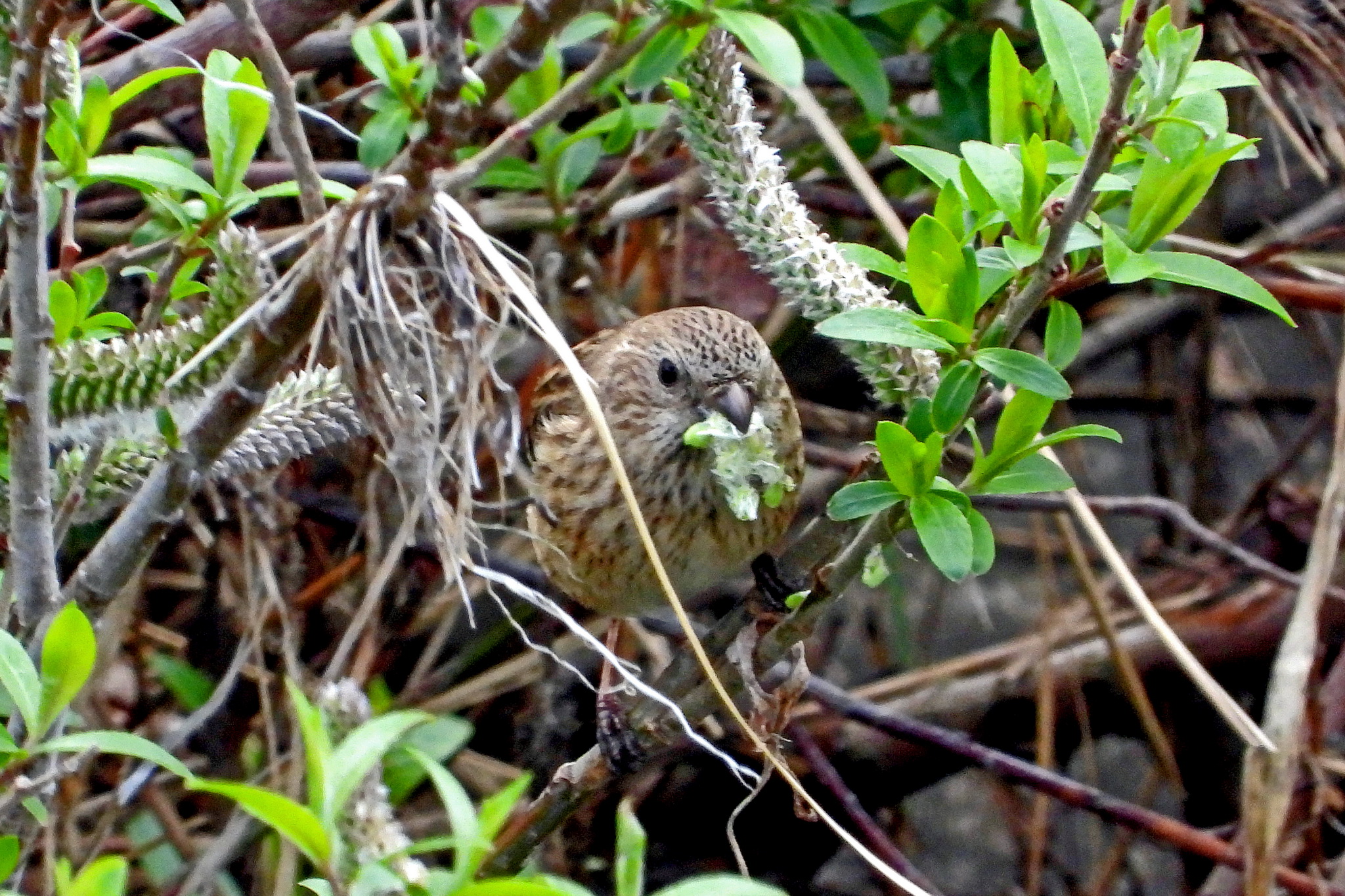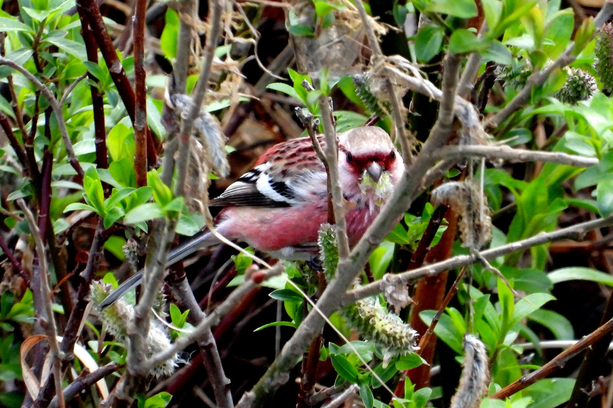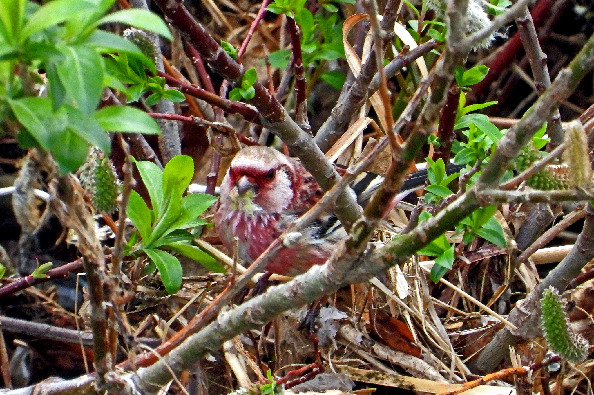あそこに「ベニマシコ」のオスとメスが居るとのこと。