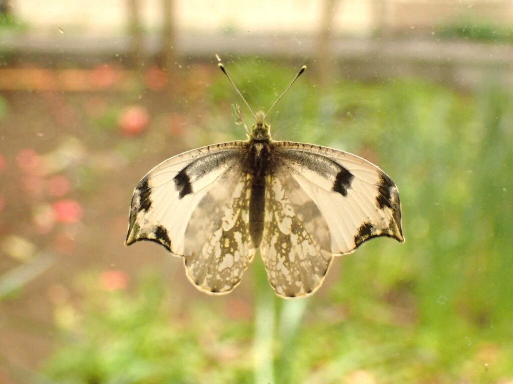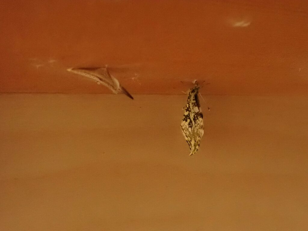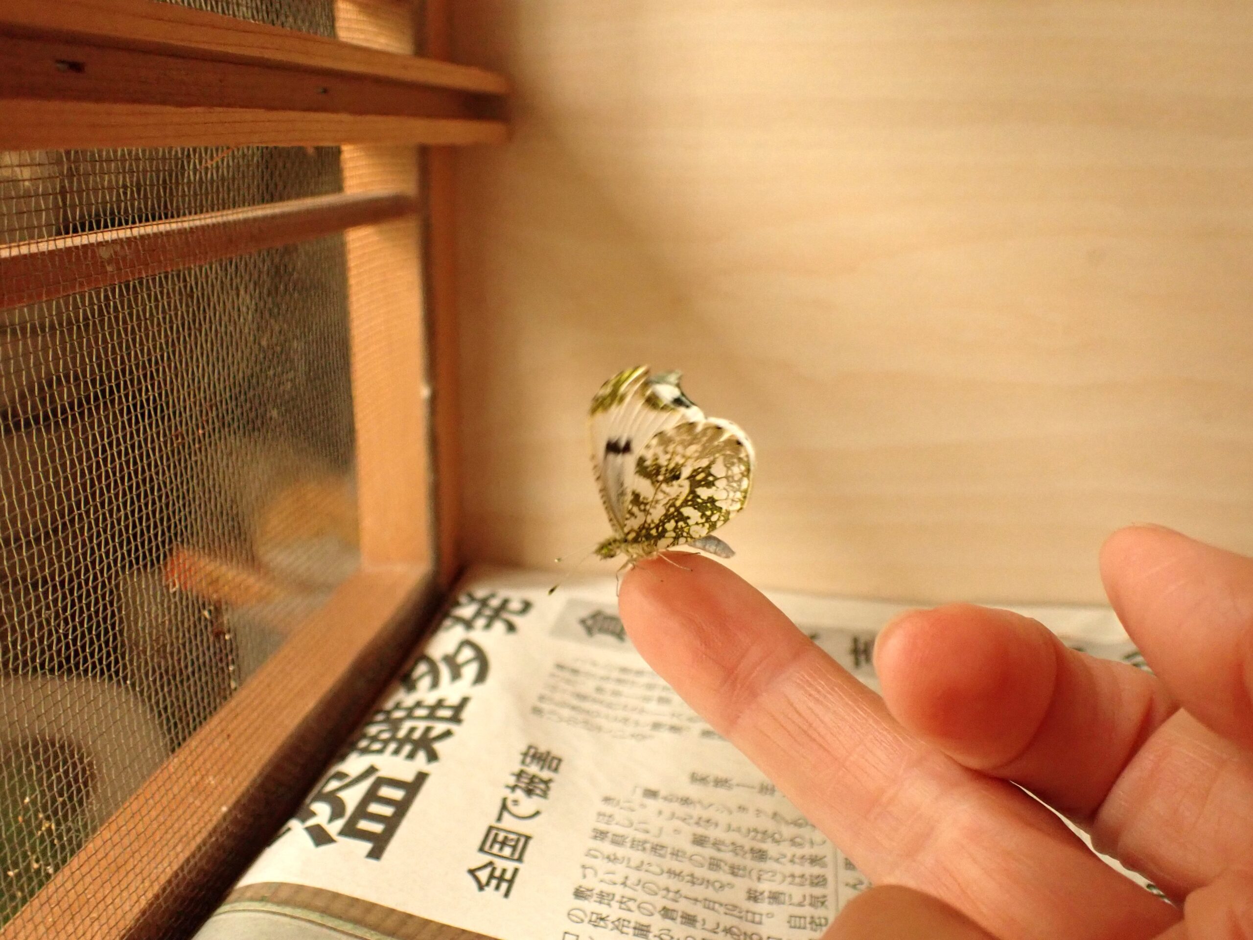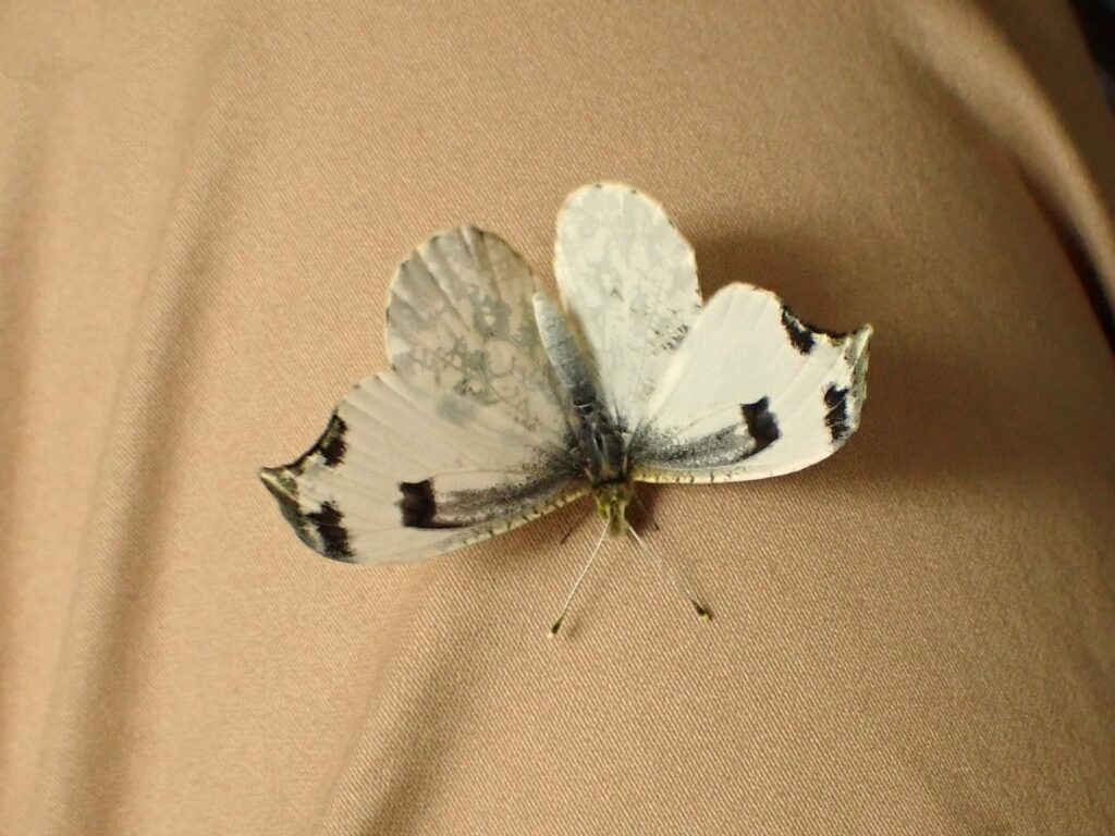 地元で3月24日にツマキチョウ♂を初見してから、毎日飼育箱天井に付いた蛹に「もう仲間が飛んでいるから、早く出ておいで」と声を掛けました。2年目だったので今年こそはと期待していたので、すごく嬉しいです。午前中は用事で出かけ昼に戻りましたが、その時は翅を開いたので女の子であることがわかりました。ツマキチョウ♀は今季初見です。