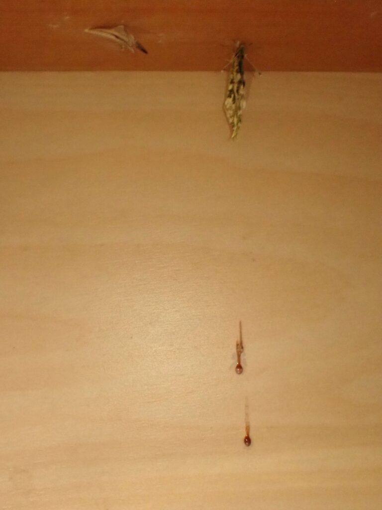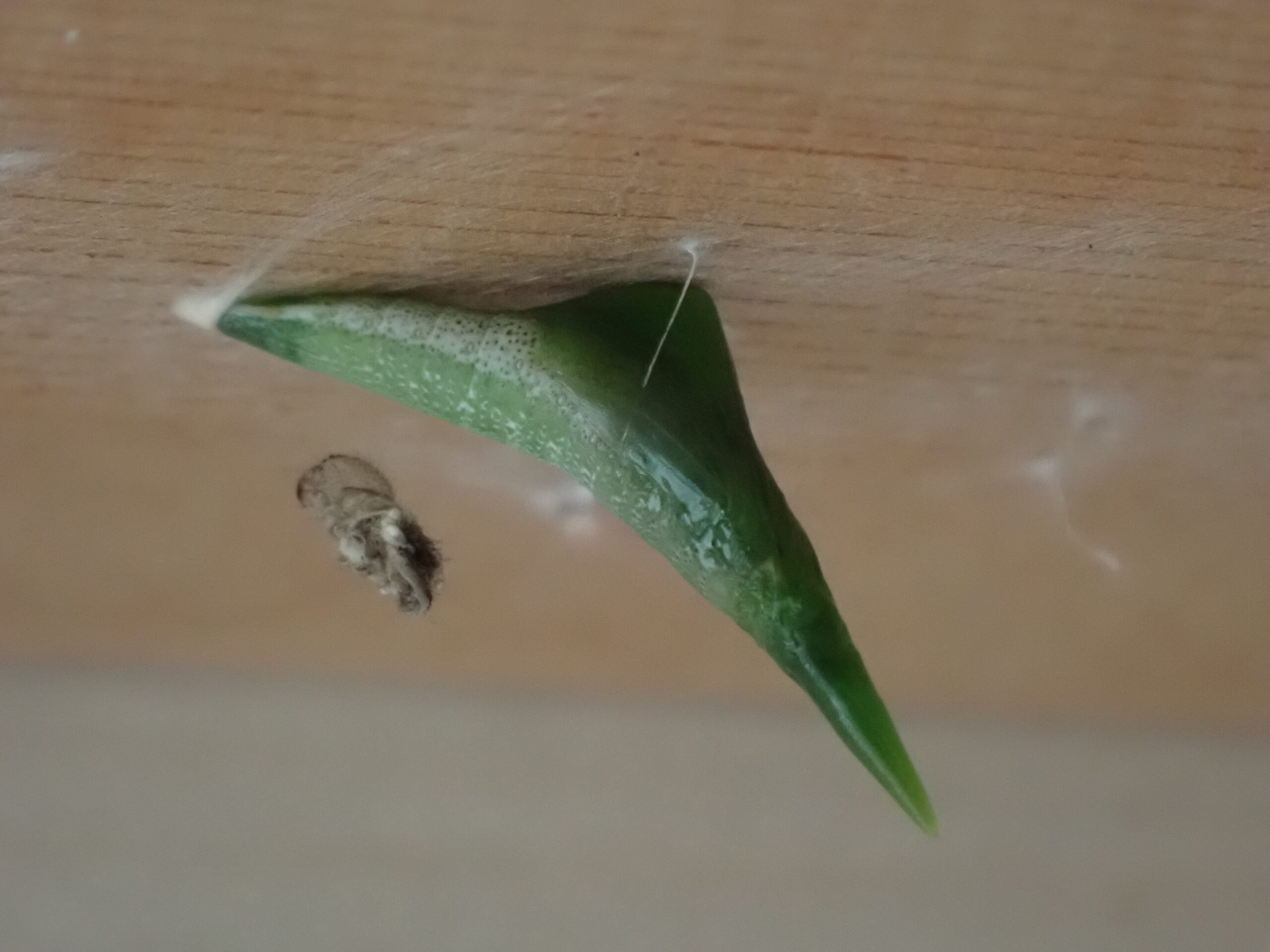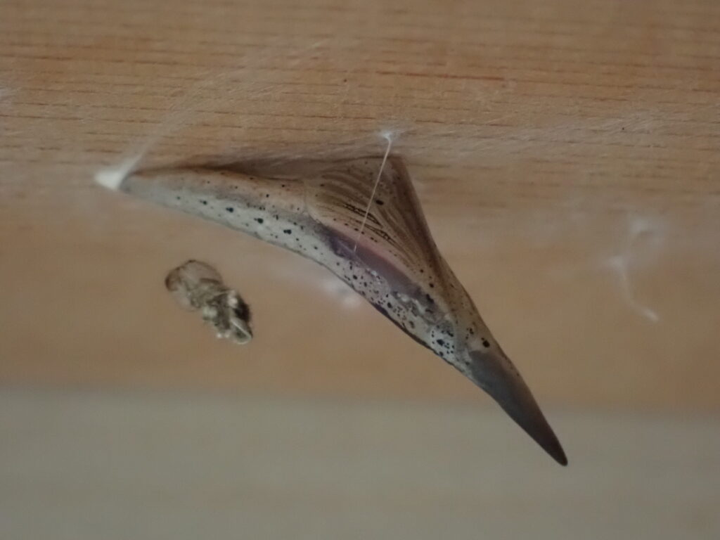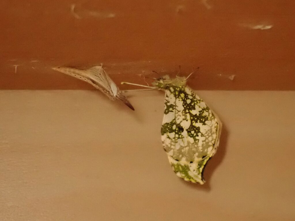 一昨年の4月7日産み付けられたばかりの、卵から育てたツマキチョウが今朝無事に誕生しました。昨日の朝から蛹が黒く変わってきたので、羽化が近いとは思ったのですが、今朝6時半に見た時はもう終わっていました。私が見たのは赤っぽい液体を出したところだけ。まだ翅を開くことなくじっとしており、未明に羽化したと思われますが、異常がなくてよかったです。