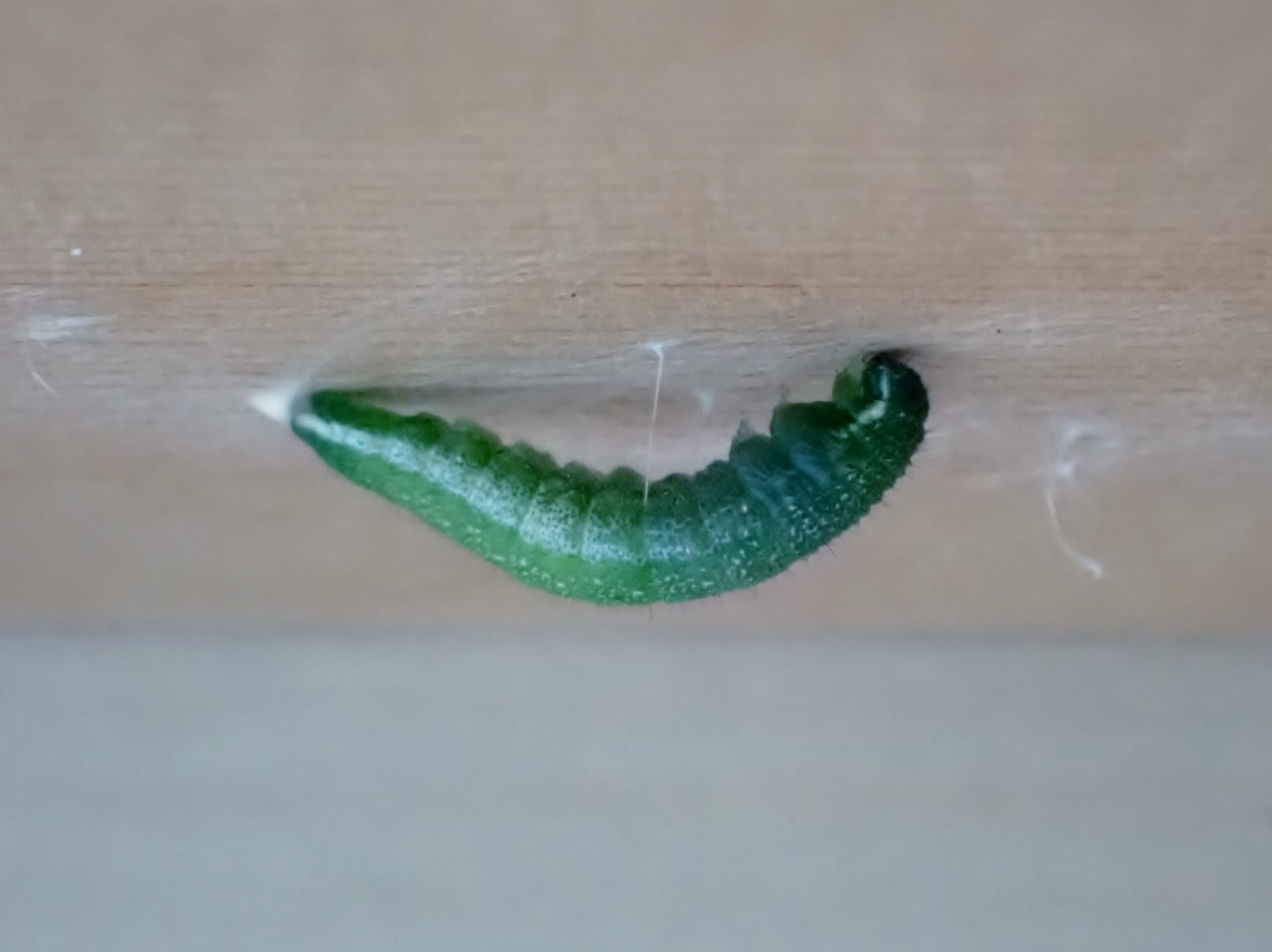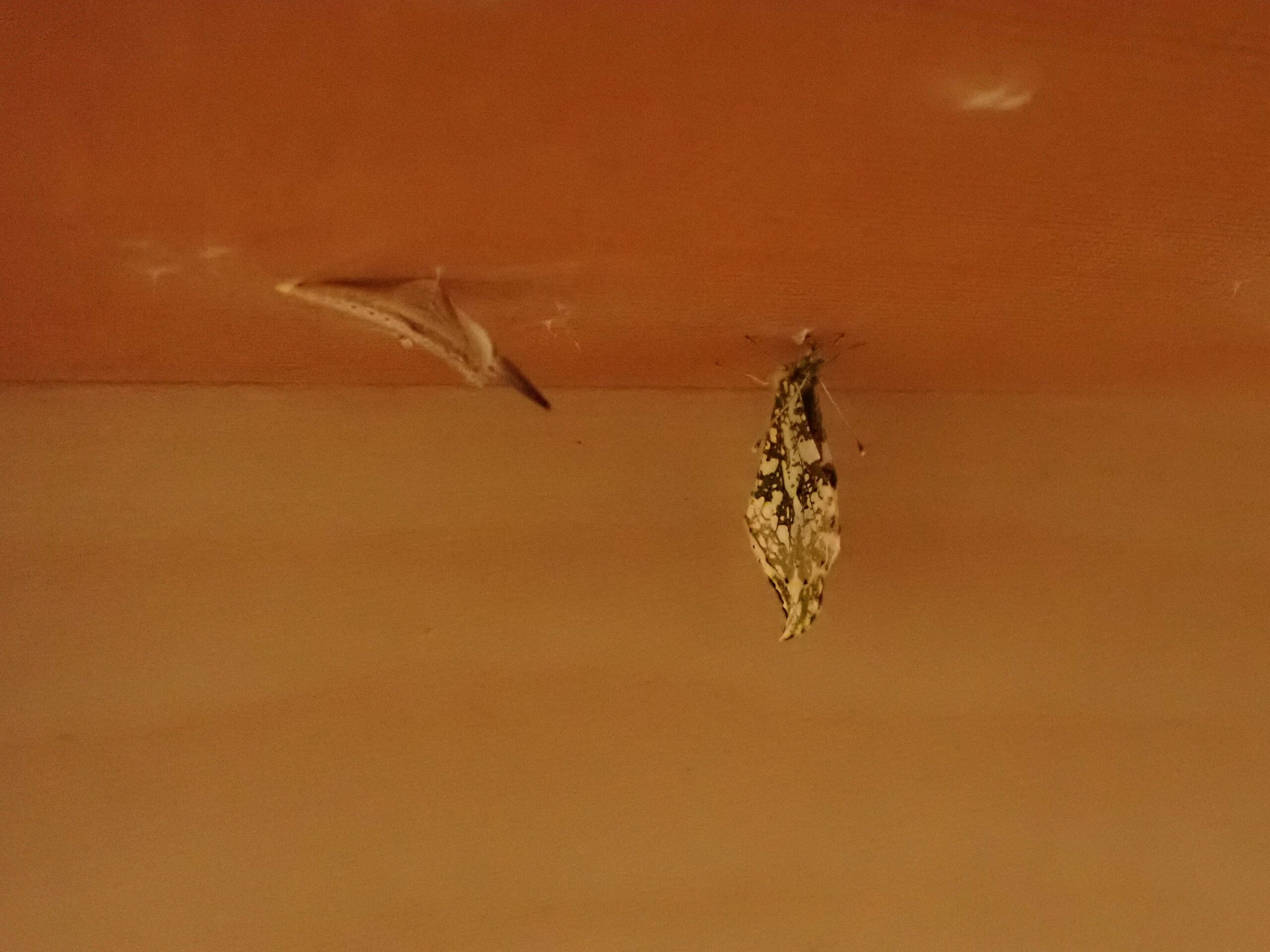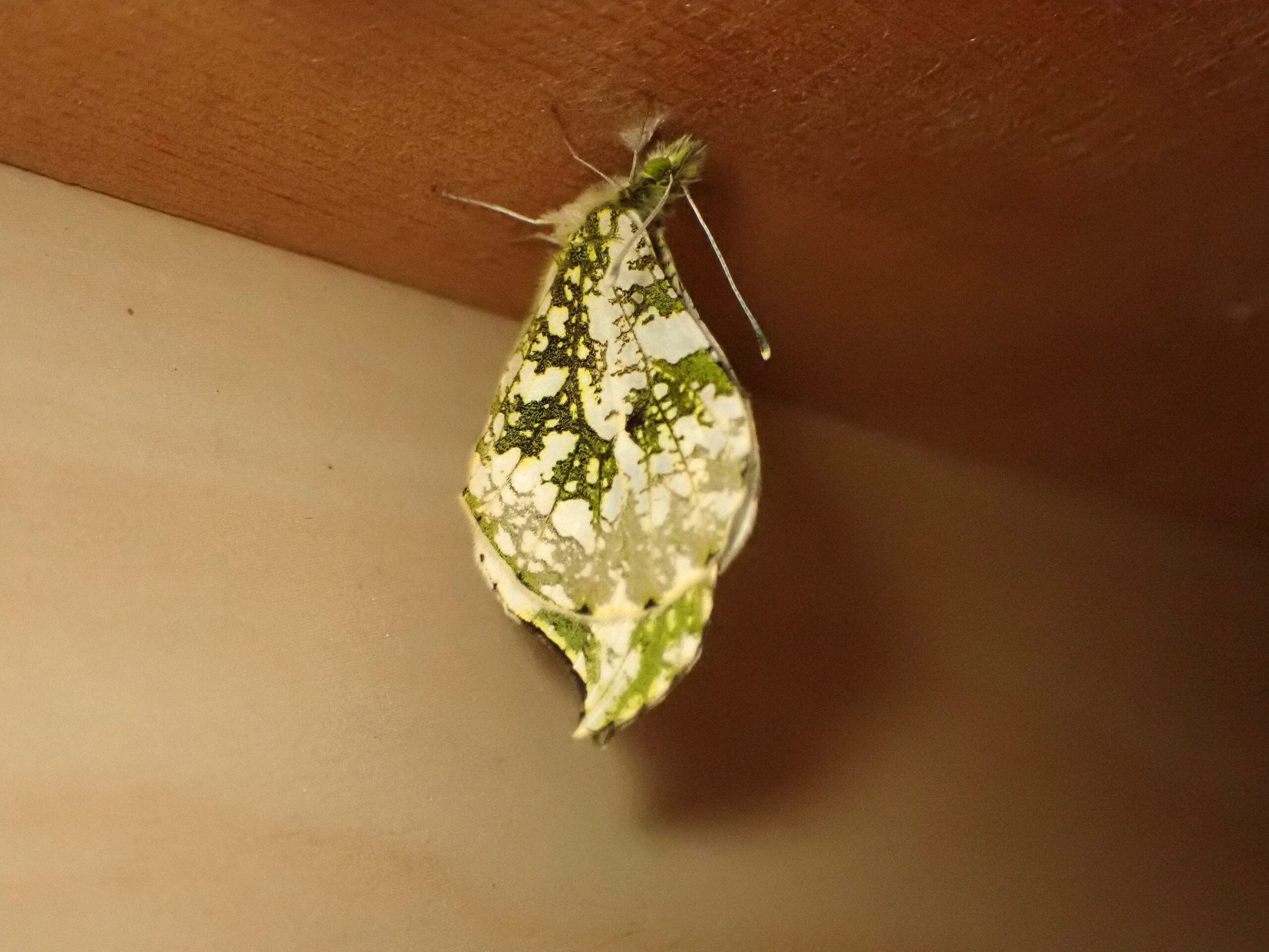 一昨年の4月7日産み付けられたばかりの、卵から育てたツマキチョウが今朝無事に誕生しました。昨日の朝から蛹が黒く変わってきたので、羽化が近いとは思ったのですが、今朝6時半に見た時はもう終わっていました。私が見たのは赤っぽい液体を出したところだけ。まだ翅を開くことなくじっとしており、未明に羽化したと思われますが、異常がなくてよかったです。