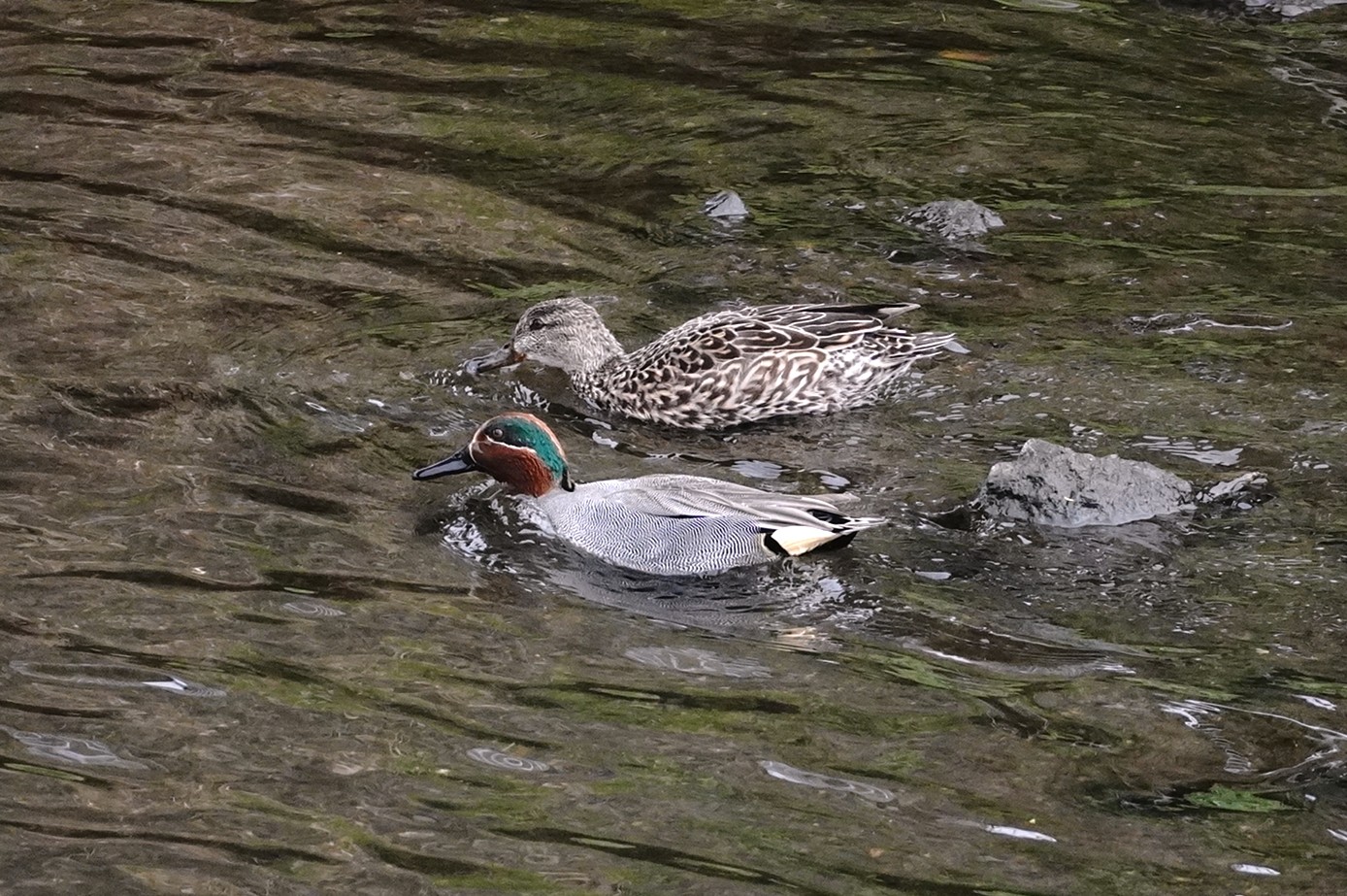 コガモ 冬鳥 上に見える茶色っぽいのが♀ 下が♂