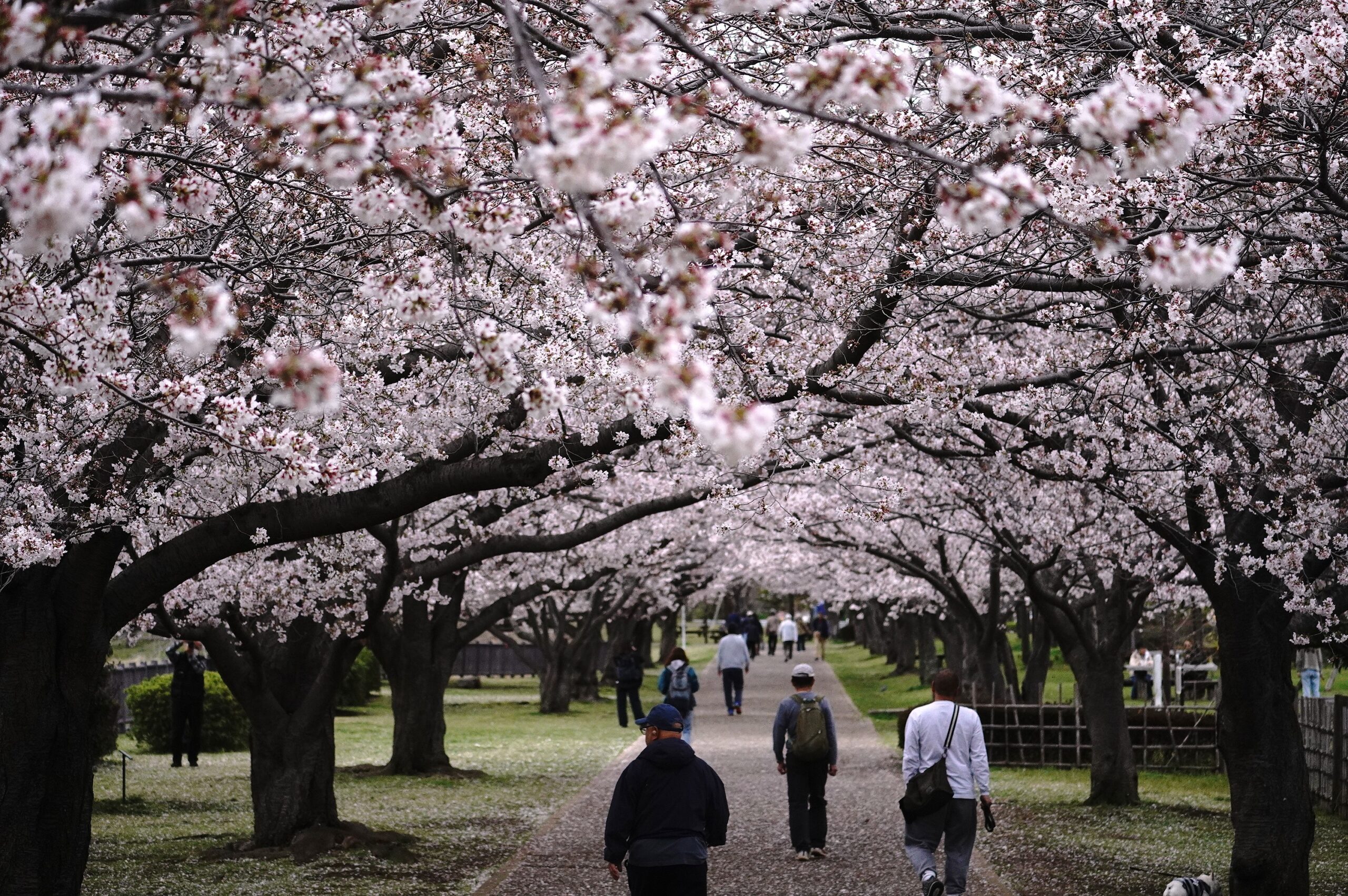 引地川親水公園の桜並木は満開の一歩手前も、昨日の激しい風雨のせいか花びらがかなり落ちていました。午後から雨予報のため、たくさんの人がお花見に。