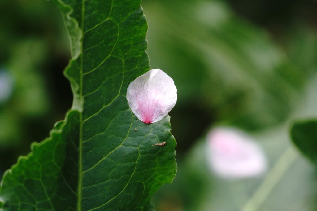 昨日の風雨で散った花びら 葉っぱに張り付いていました