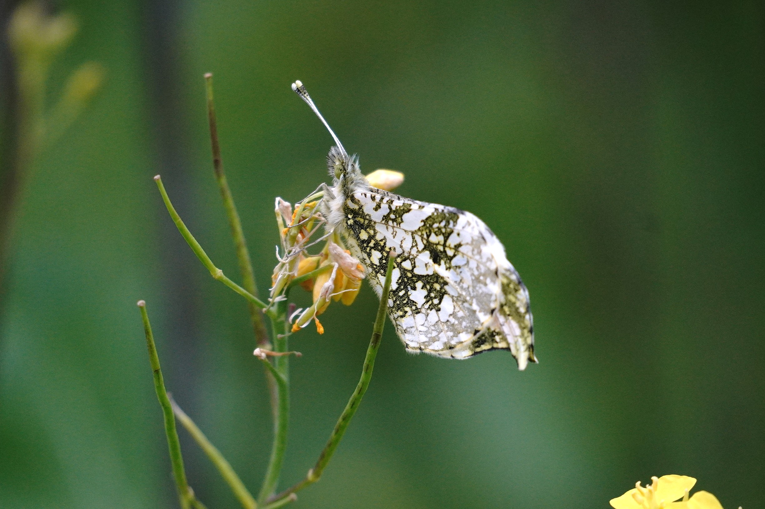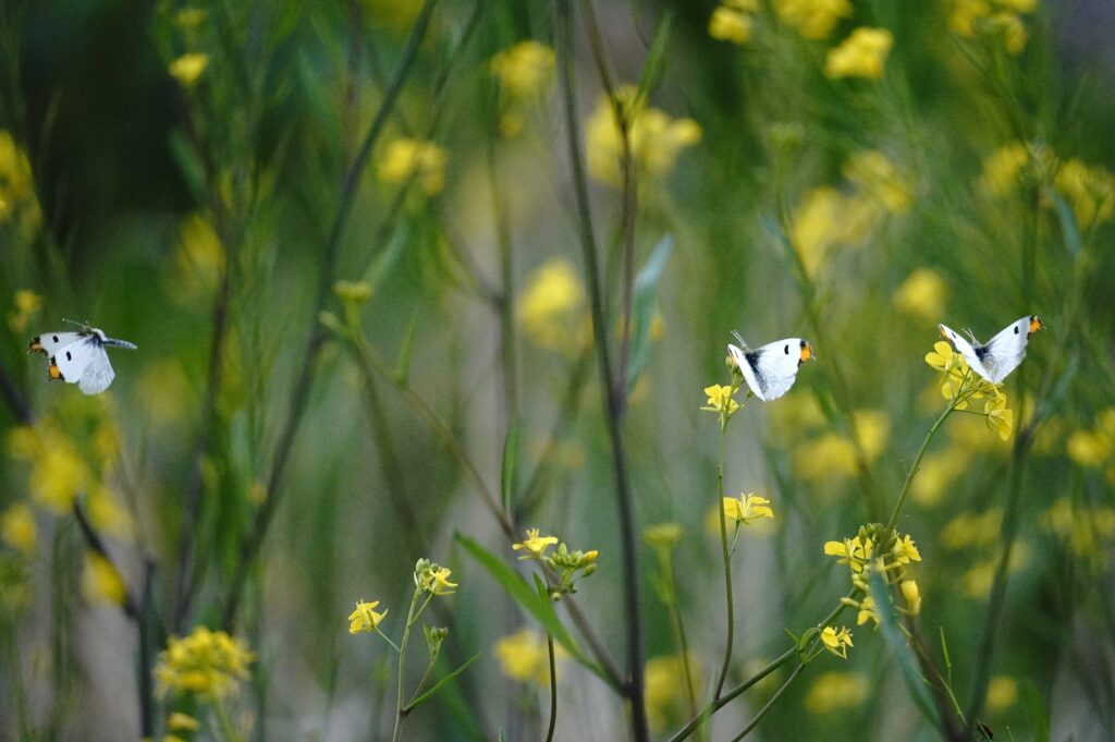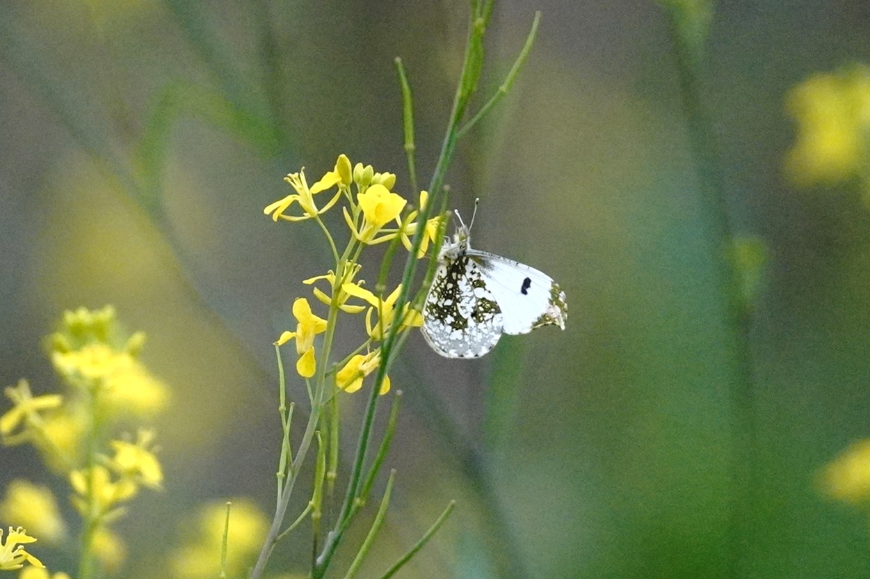 離れた場所でまたツマキチョウ発見 そばに行ってもそのままじっとしているので、指でつまみ翅を確認 オレンジ色で♂でした 元に戻すと元気に飛んで行きました 今や活動の最盛期なんですね
