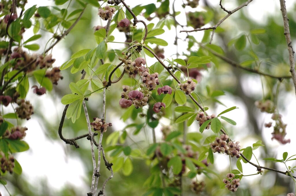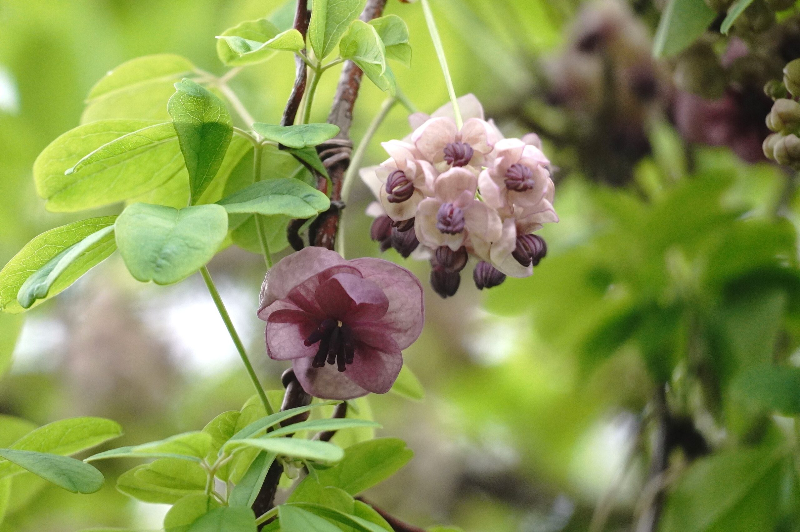 アケビは1つの株に雄花と雌花の両方が咲きます 大きな花は雌花で、この雌花が後に、大きなアケビの実になるそうです