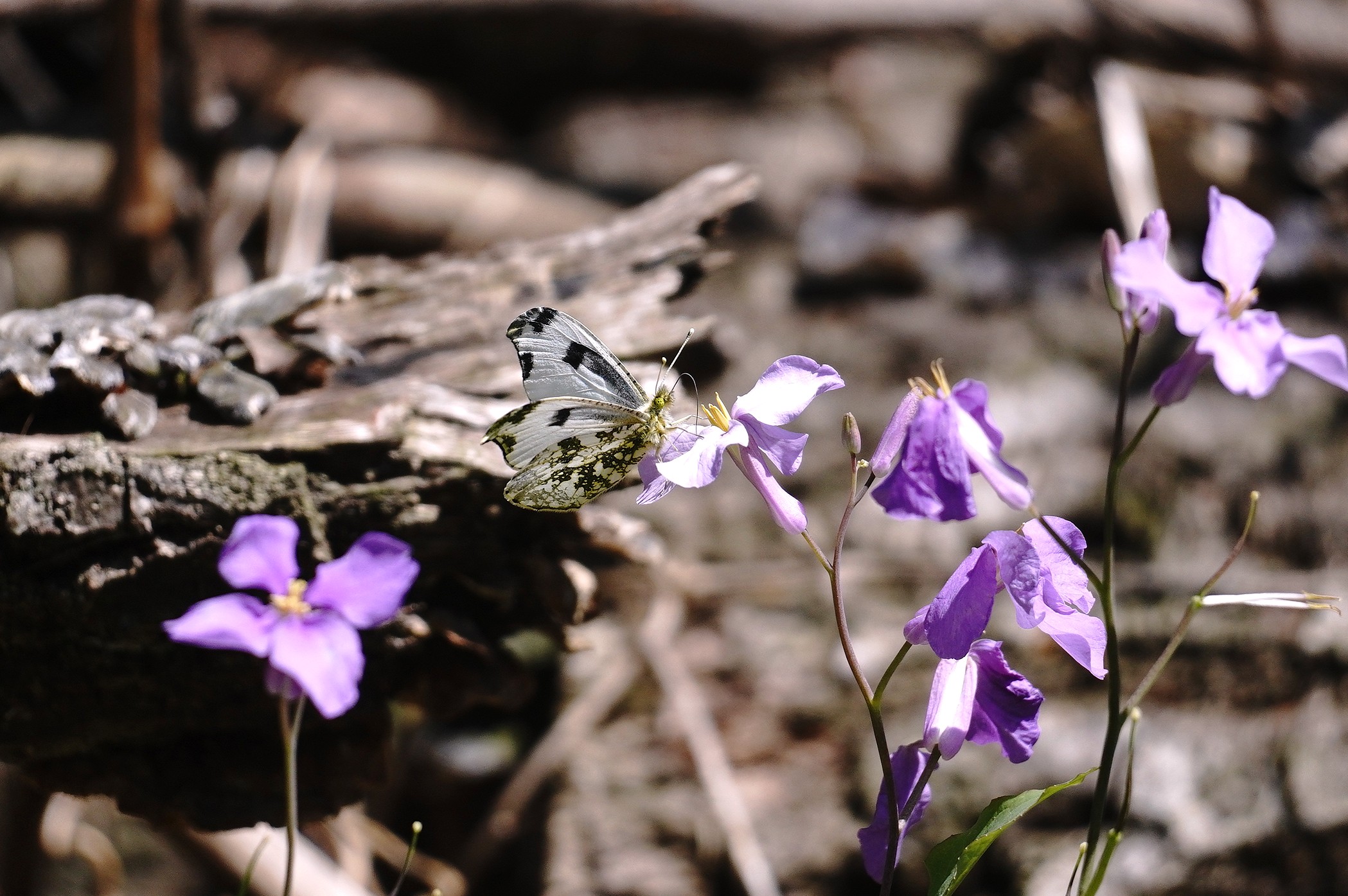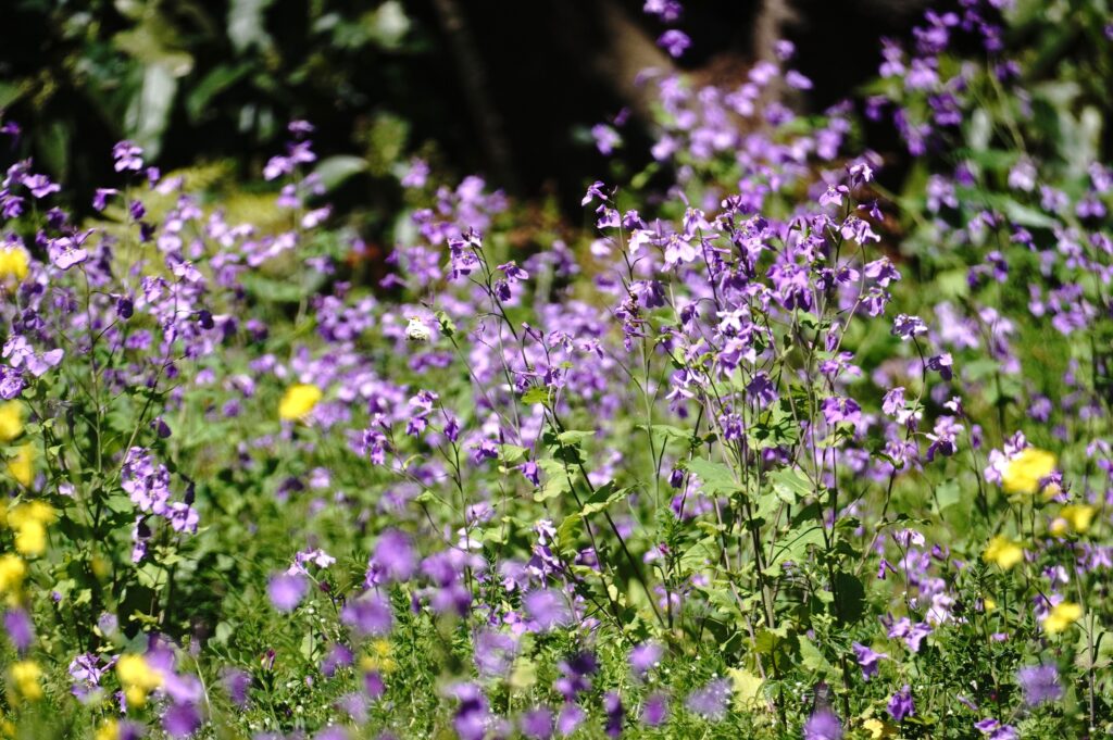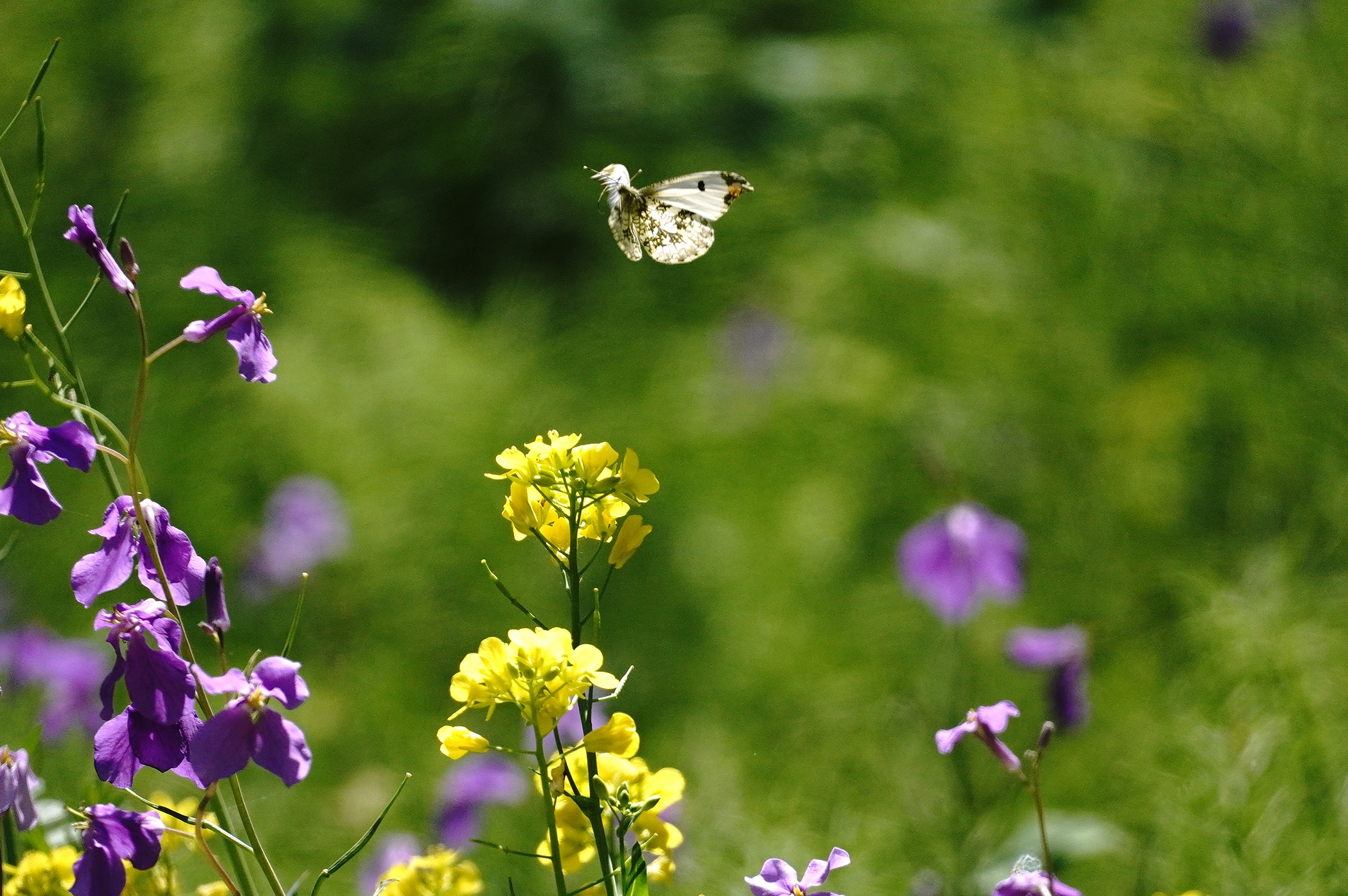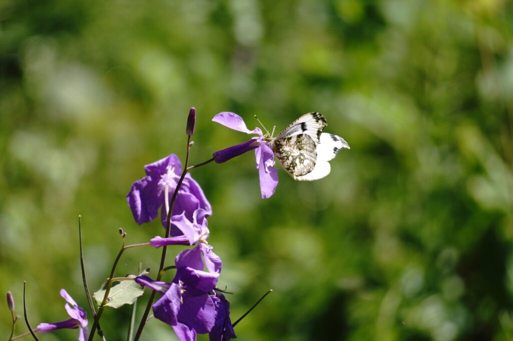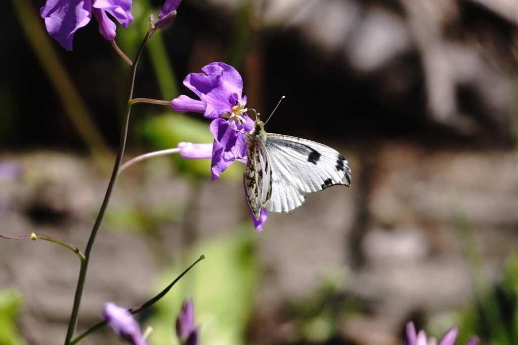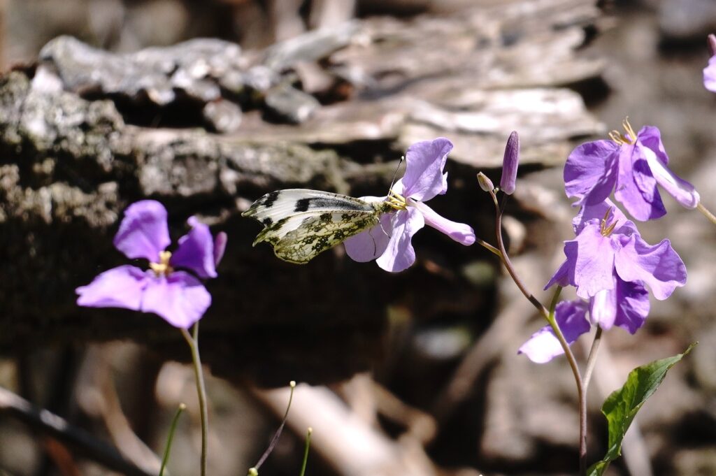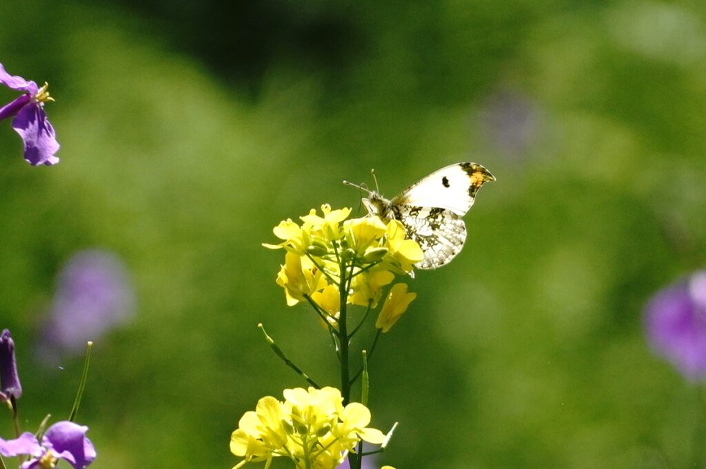 2年ぶりのふる里に着くと同時に翅をバタバタさせ、空気を感じ取ったようです。飼育箱の中では羽ばたくことなく、カラシ菜を置いても一切口にすることも止まることもなく、じっとしているおとなしい女の子でした。それが急に羽ばたくので驚きましたが、外に飛び出すとすぐ近くのショカッサイに止まり、すごい勢いで吸蜜開始。よっぽど空腹だったのかむさぼるようでした。約15分、動いては吸蜜を繰り返し、空高く飛んで行きました。その後は他のツマキチョウや植物を撮ったりして過ごし帰ろうとした時、最後にもう一度近くに来てくれました。あのむさぼるような吸蜜はツマちゃんに間違いありません。これならきっと良い婿さんと巡り合い、産卵して命を繋いでいくことでしょう。安心して帰ることができました。