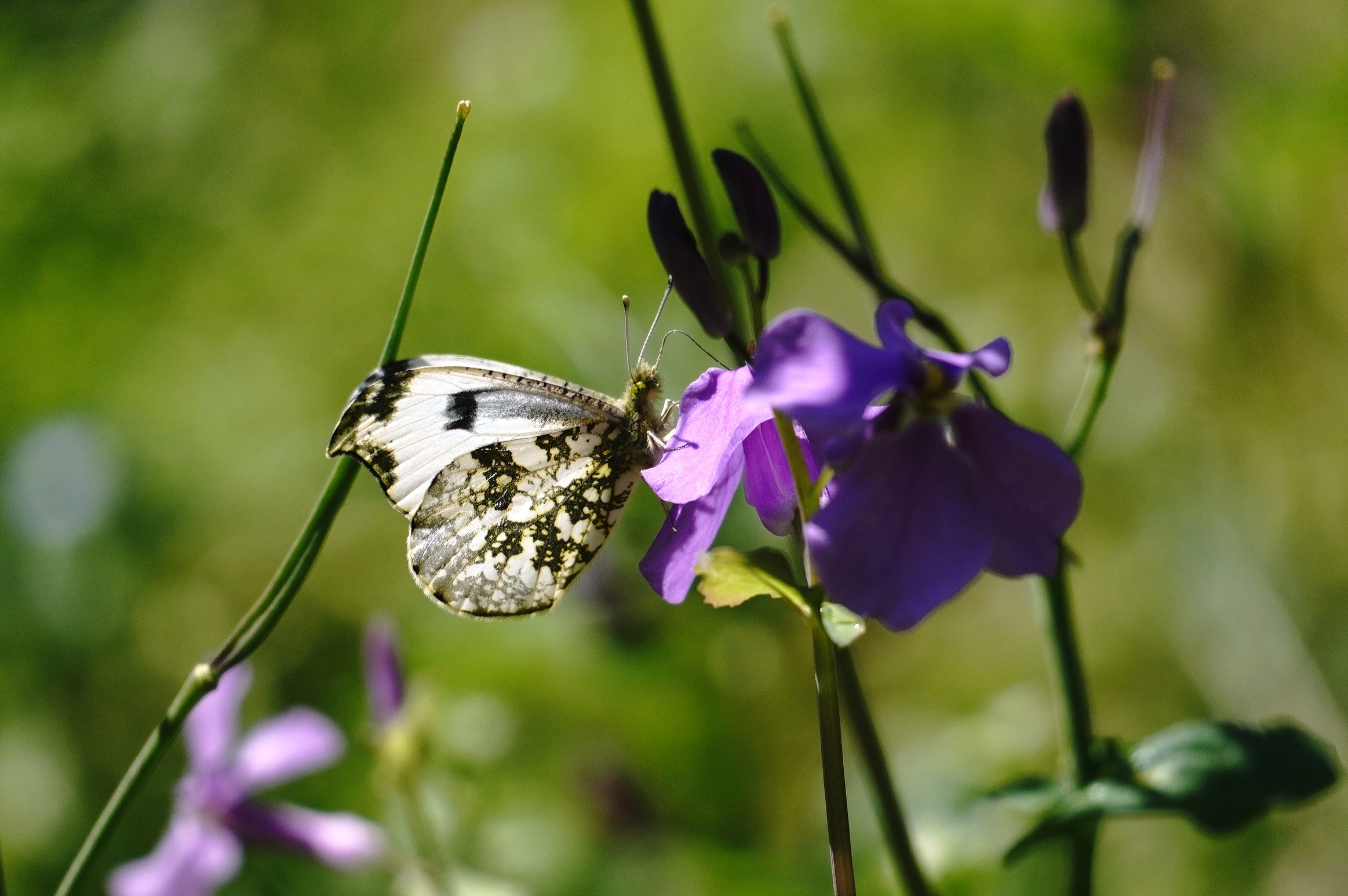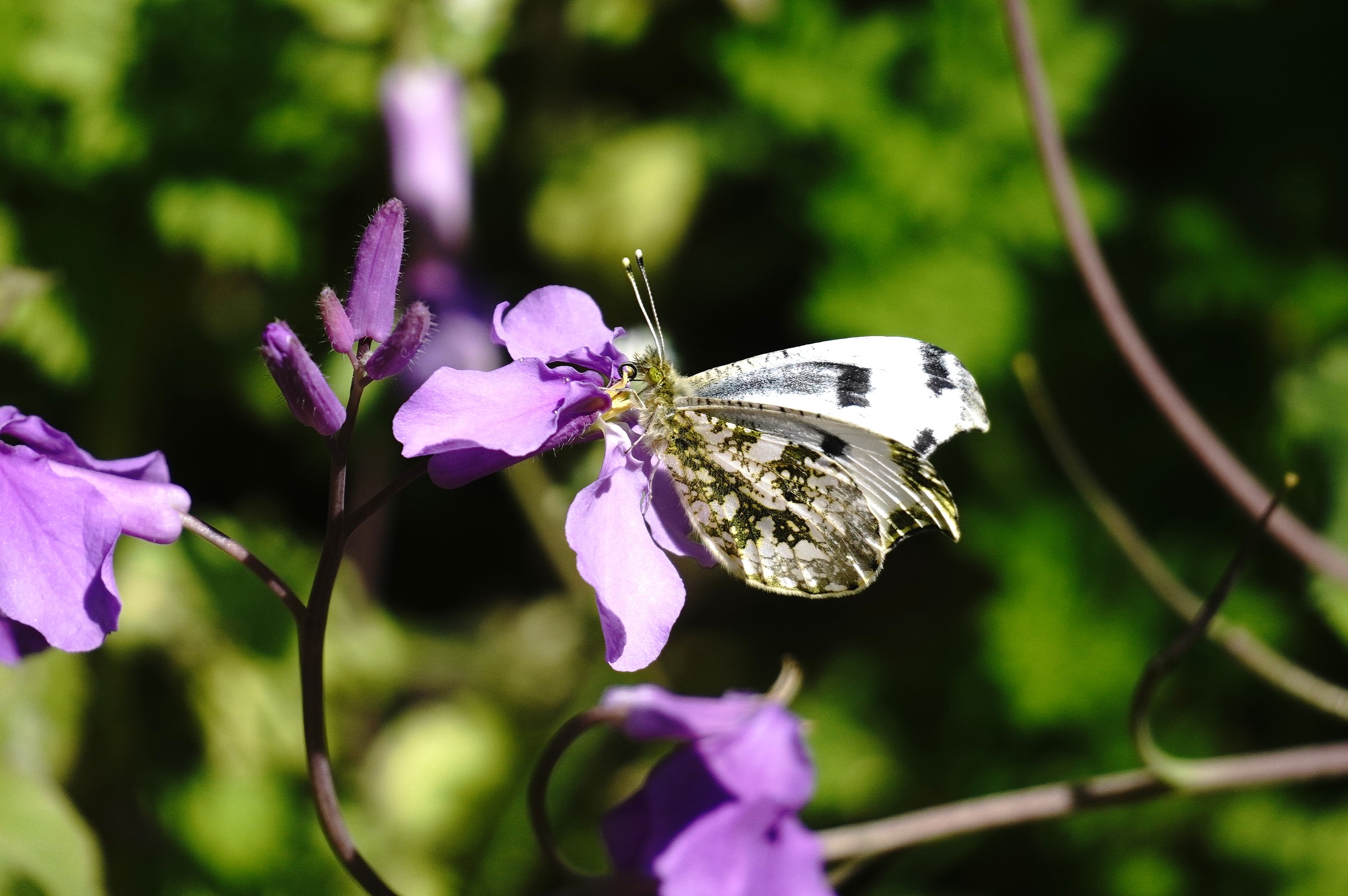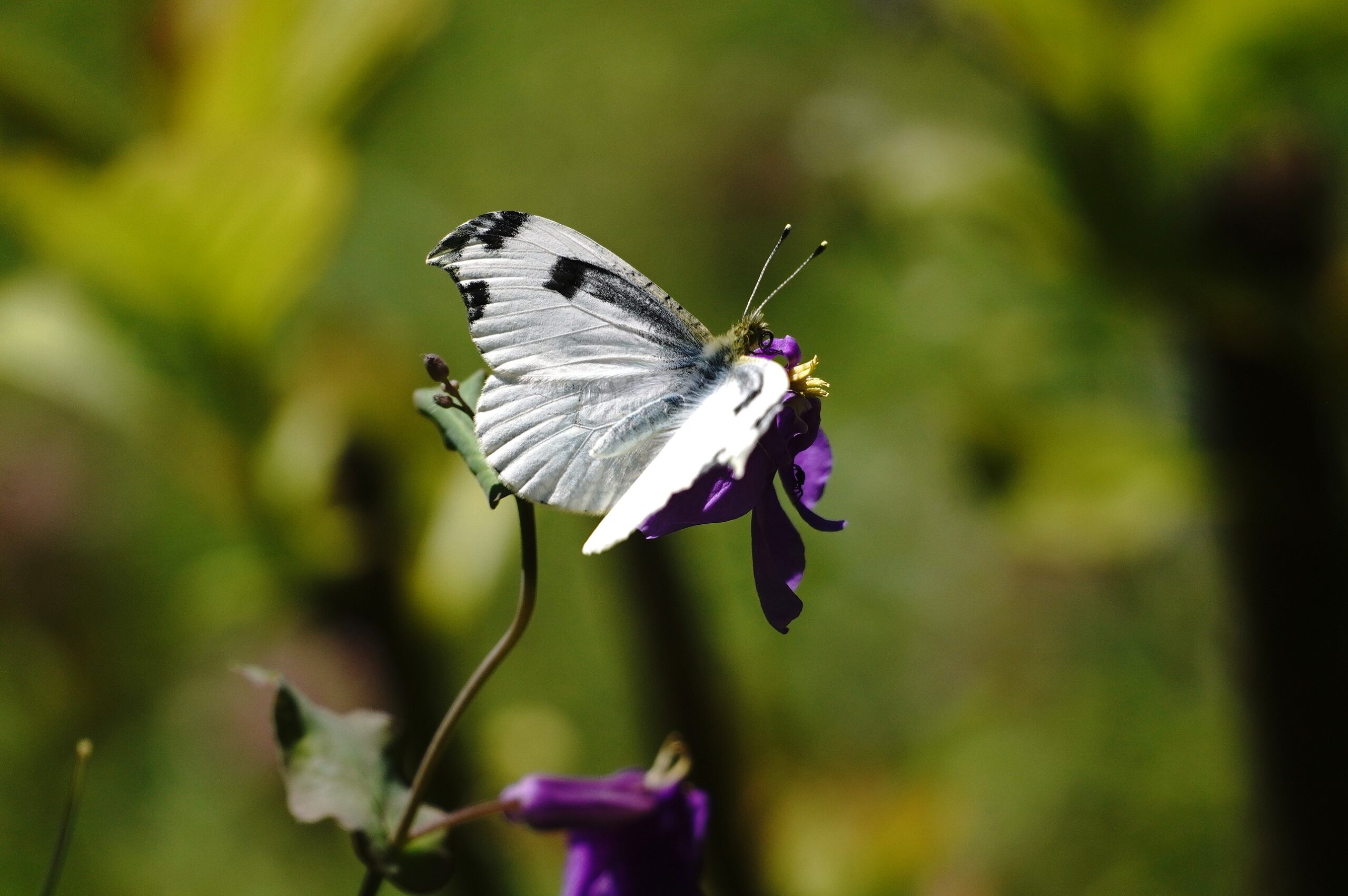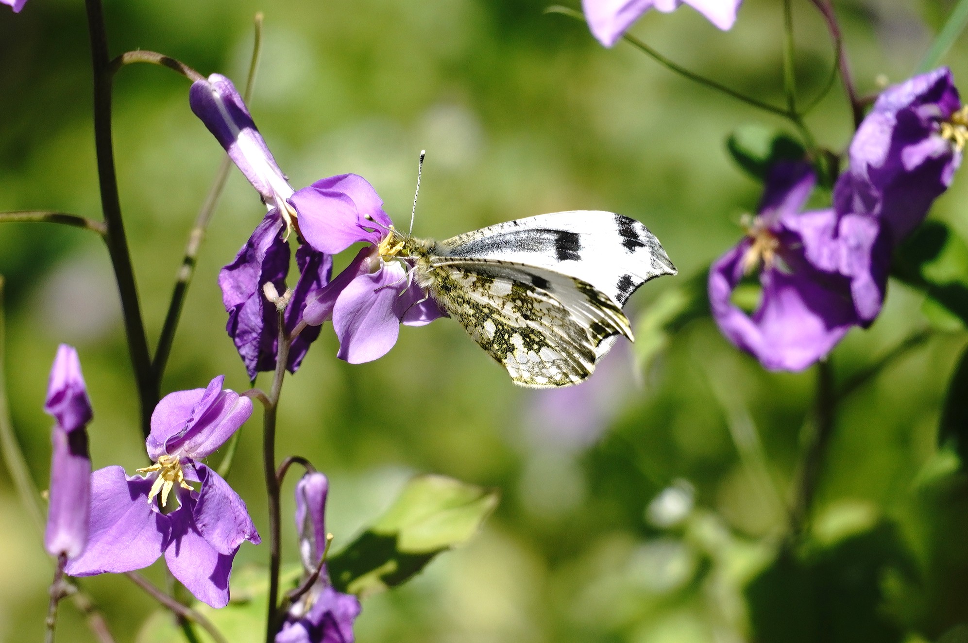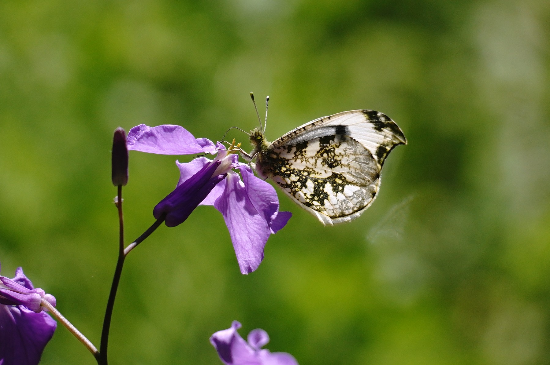 2年ぶりのふる里に着くと同時に翅をバタバタさせ、空気を感じ取ったようです。飼育箱の中では羽ばたくことなく、カラシ菜を置いても一切口にすることも止まることもなく、じっとしているおとなしい女の子でした。それが急に羽ばたくので驚きましたが、外に飛び出すとすぐ近くのショカッサイに止まり、すごい勢いで吸蜜開始。よっぽど空腹だったのかむさぼるようでした。約15分、動いては吸蜜を繰り返し、空高く飛んで行きました。その後は他のツマキチョウや植物を撮ったりして過ごし帰ろうとした時、最後にもう一度近くに来てくれました。あのむさぼるような吸蜜はツマちゃんに間違いありません。これならきっと良い婿さんと巡り合い、産卵して命を繋いでいくことでしょう。安心して帰ることができました。