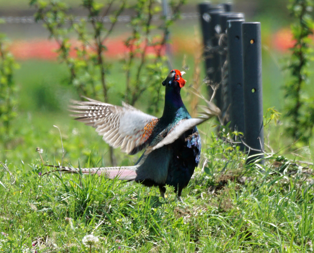 すると、農道の反対側からも、ケンケン、の声。 ちょっと遠くでしたが、オスがもう1羽。 対抗するように、ケンケン、バタバタ。