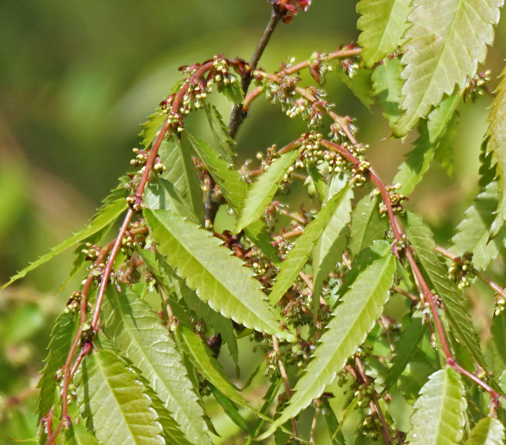 ケヤキも花とは思えない花を、葉腋につけています。