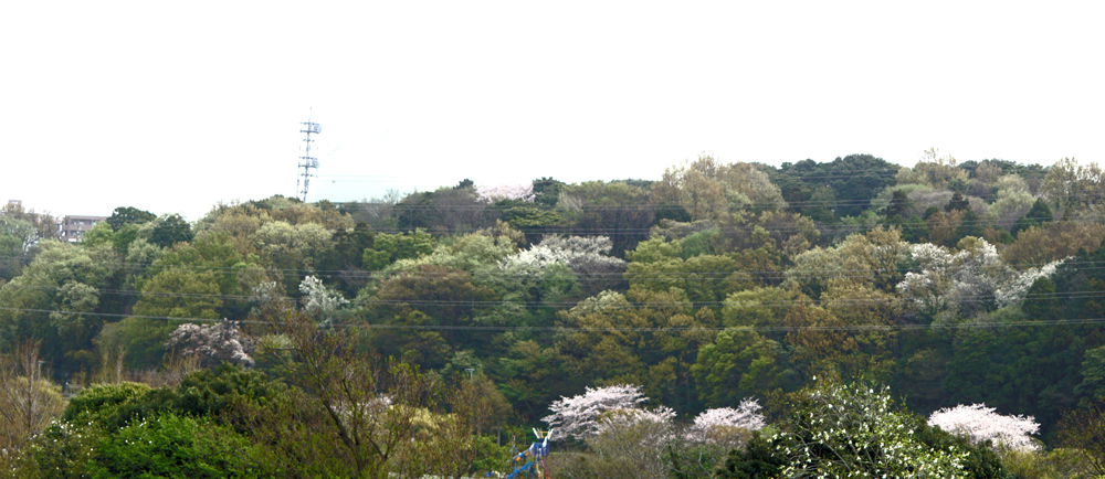 樹種ごとに微妙に異なる芽吹きの色が織りなす柔らかな緑、ところどころにサクラの淡いピンクが入って、何とも言えない春の色です。