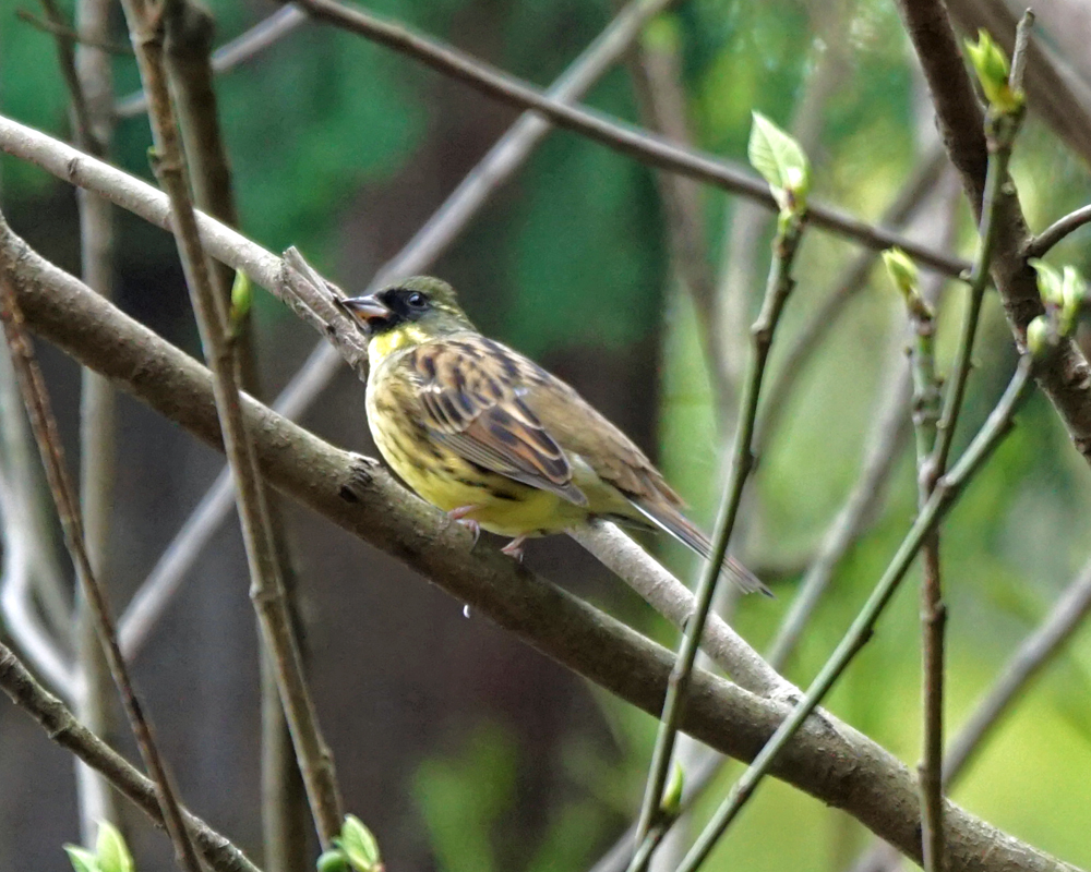 ツルカノコソウを見ていると、ちらっとアオジの囀りが。 近くの枝に居ました。 目元が真っ黒になったオス。 囀りはすぐに止んでしまい、試しにちょっと囀ってみました、という感じ。