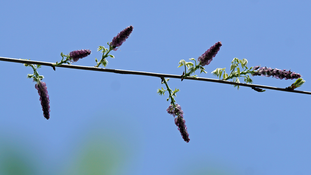 崖からヒュッと伸びたフジの枝。 蕾が紫に色づいていました。