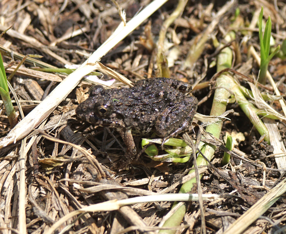 畔に小さな黒いカエル。ヌマガエルかなと思います。