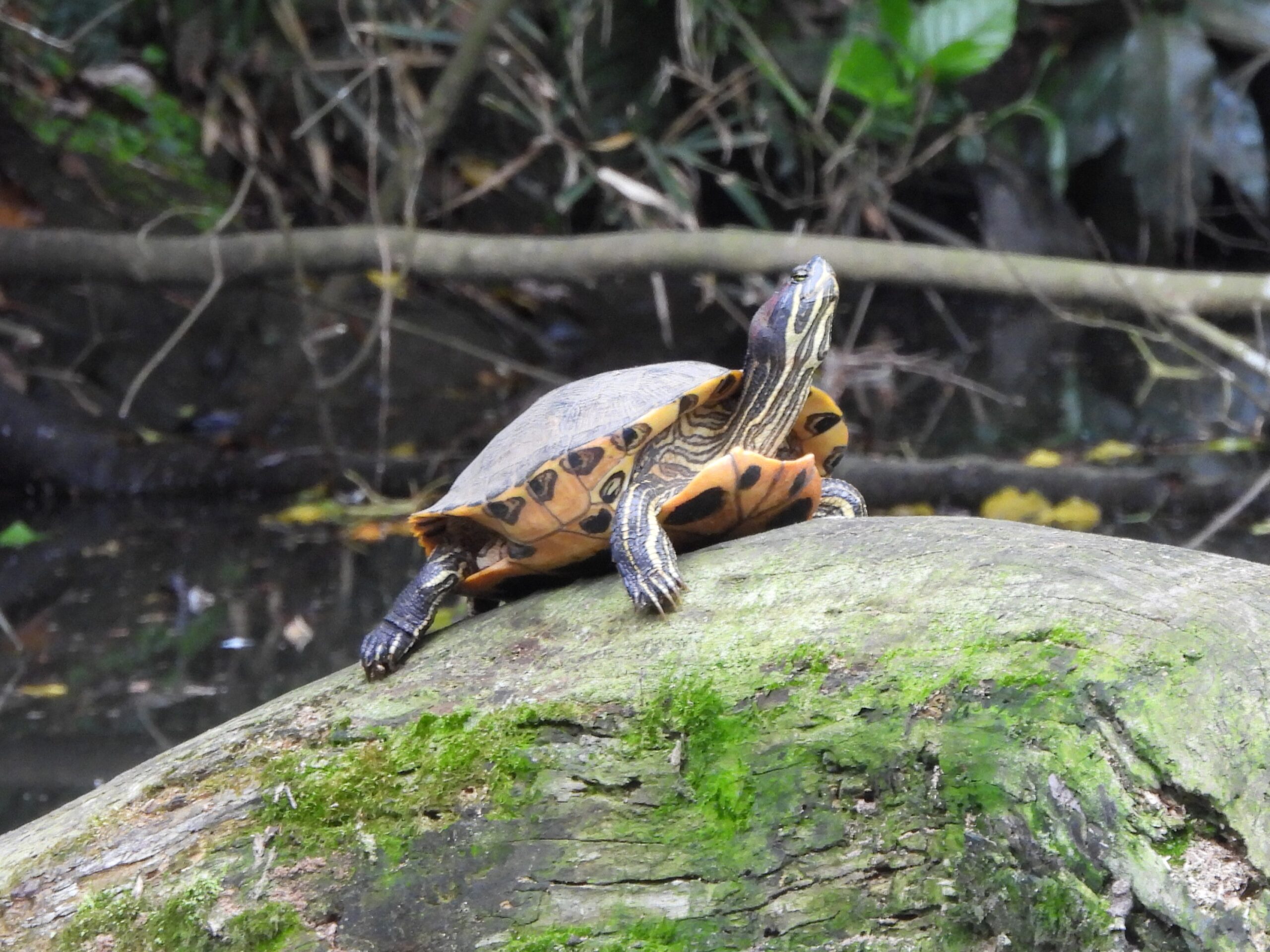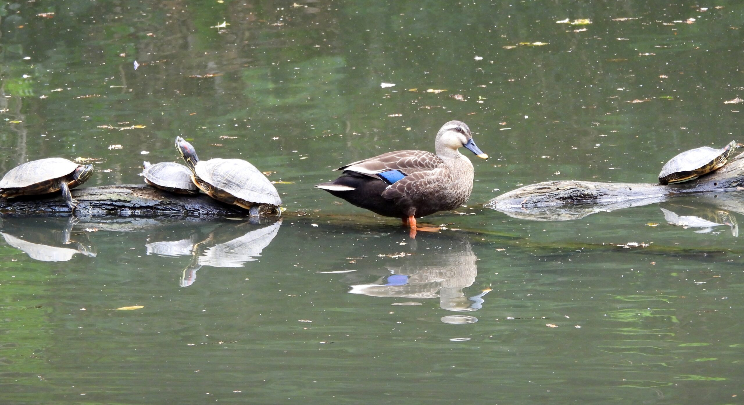 大池では、たくさんの亀が甲羅干し、そしてカルガモ、アオサギ