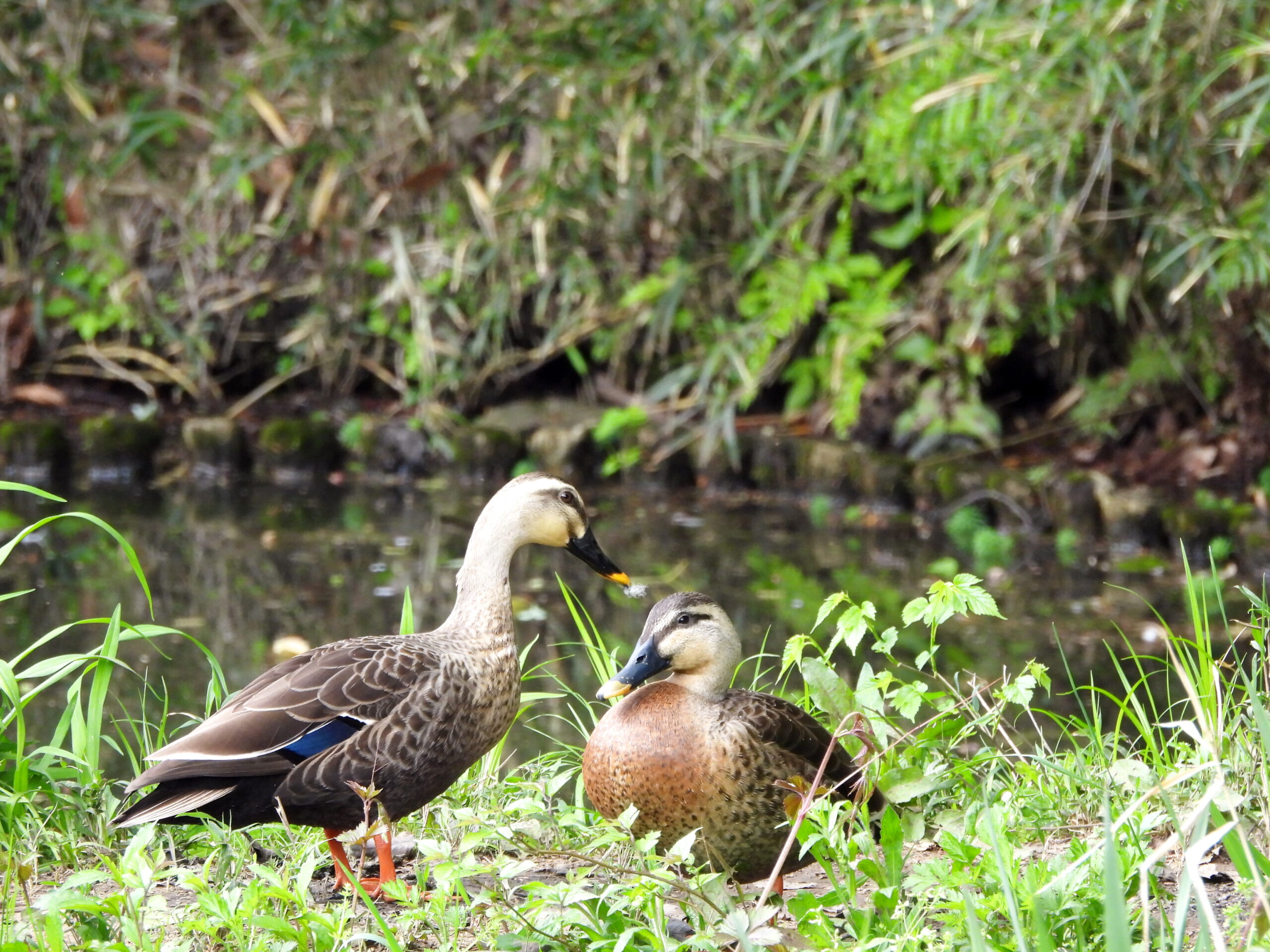 山を下りて、人工池にはカルガモと、胸辺りが異様に赤っぽい・・交雑種でしょうか