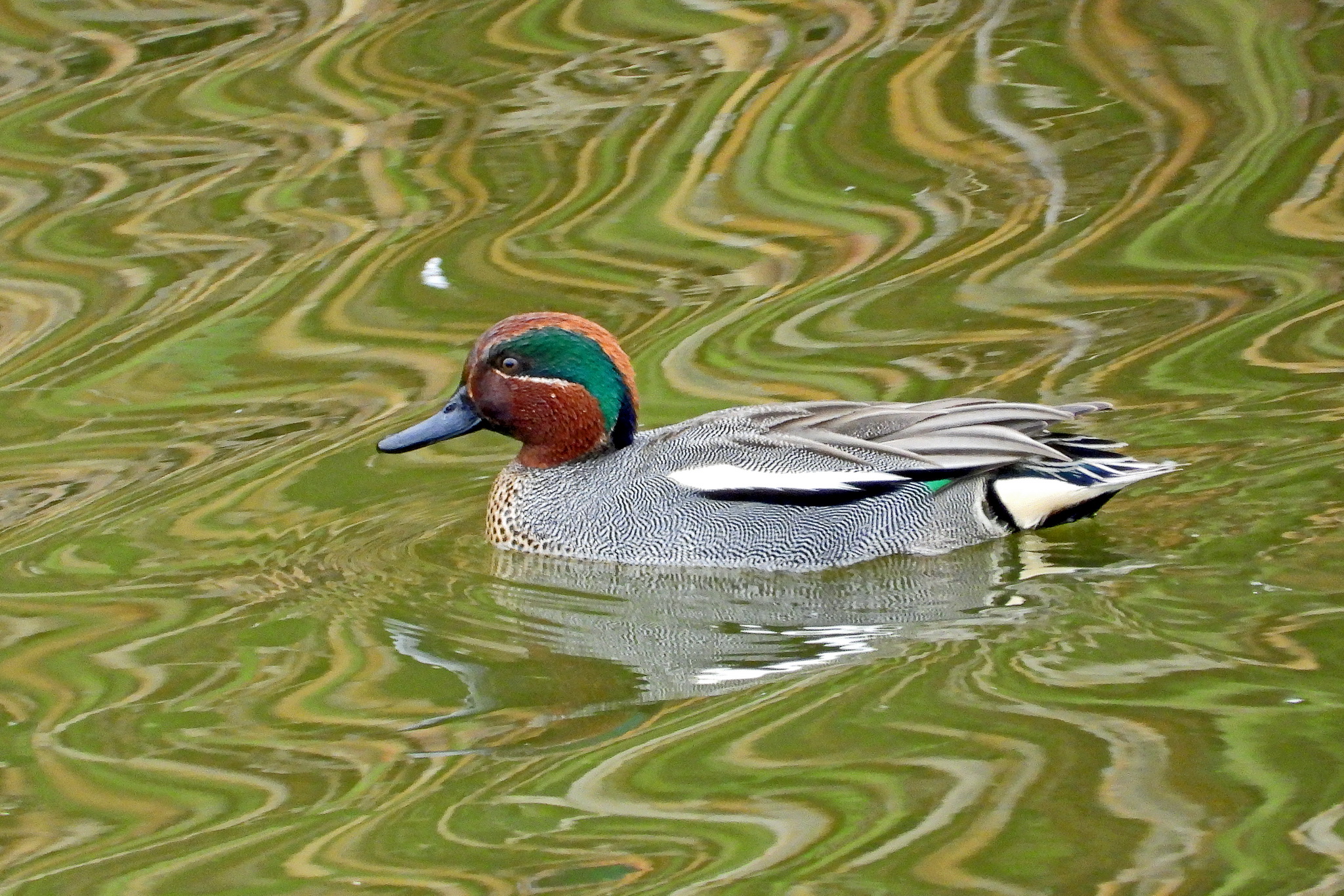 「コガモ」のオスが、泳ぎ出てきました。