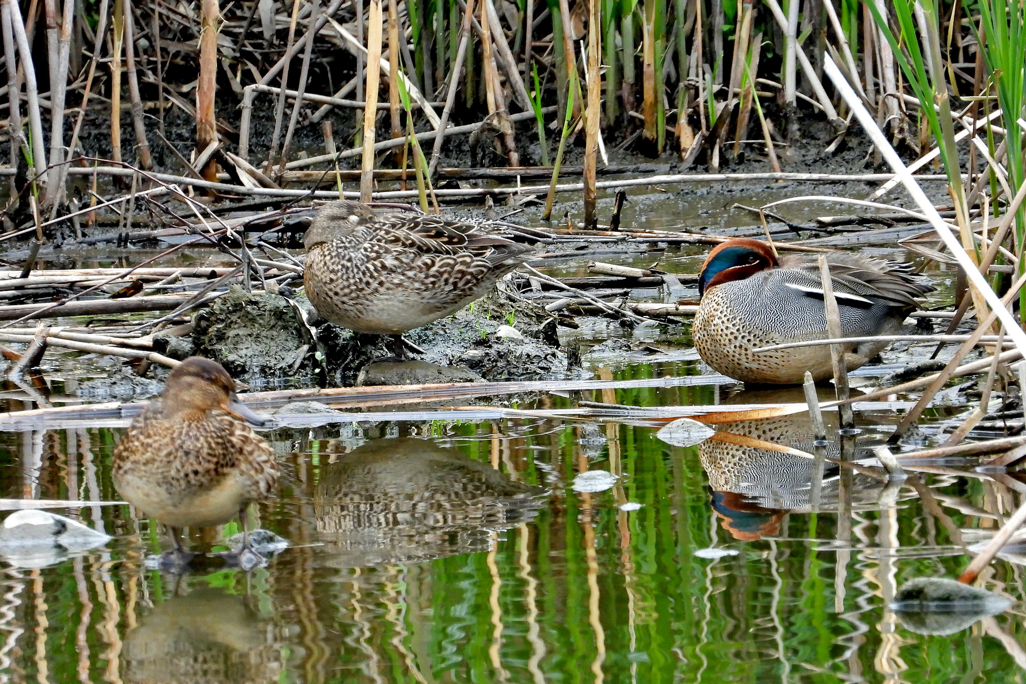葦原の少し奥まった所に「コガモ」が居ました。