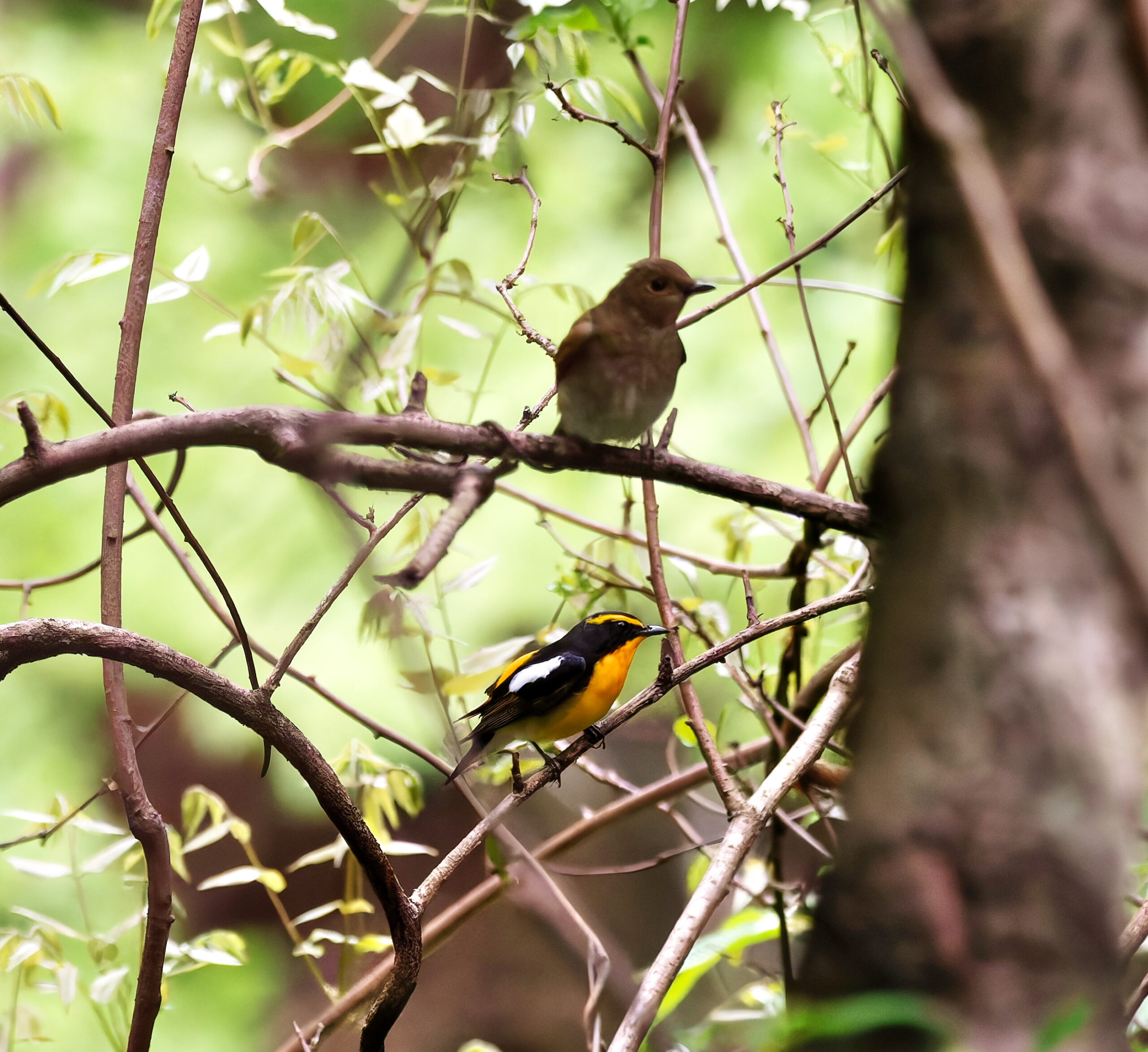 枝に止まったところでパチリ、キビタキの♂と上の枝には♀が写っていました。
