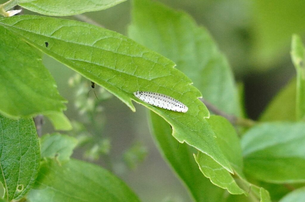 エノキの葉が虫食いになっており、よく見るとこの芋虫がたくさんいました エノキハムシの幼虫のようです