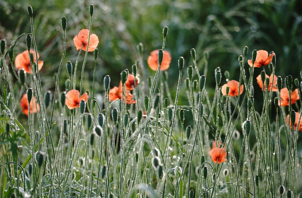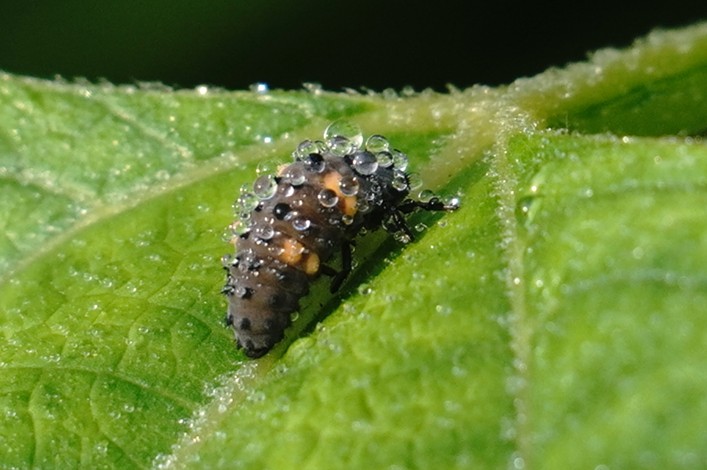 雨が上がり、道端のいつもの見慣れた草花がはっとするほど、輝いていました。葉っぱの上ではナナホシテントウの幼虫が雨粒をまとって。そんな光景に魅了された朝でした。木道でのんびり日向ぼっこのニホンカナヘビは尾の先がなく、怖い思いをしたのかも。