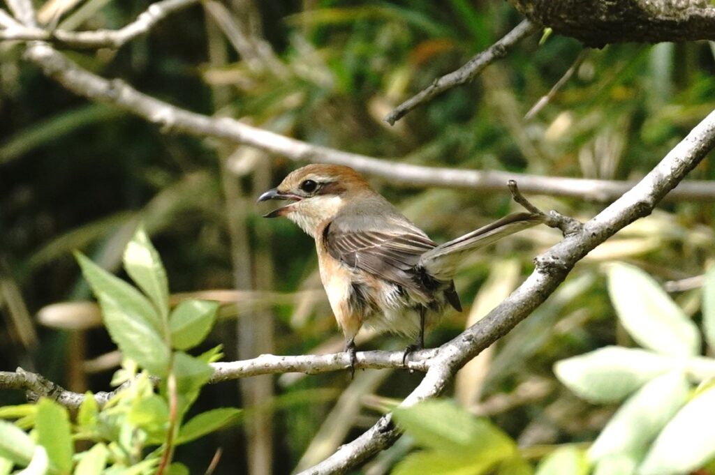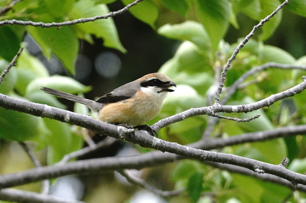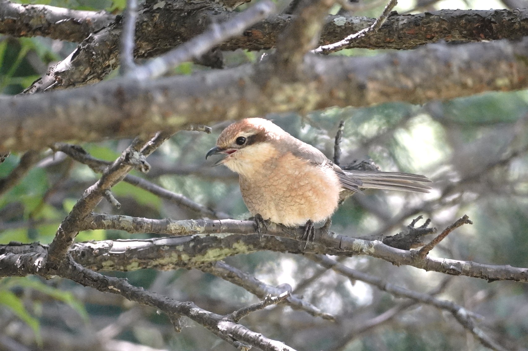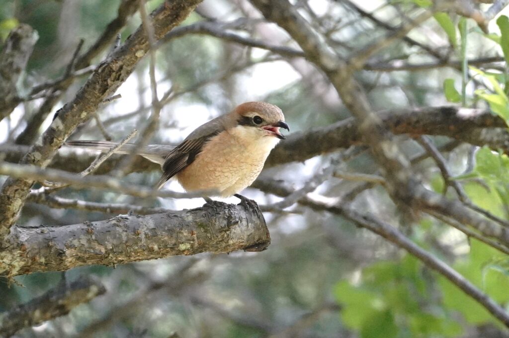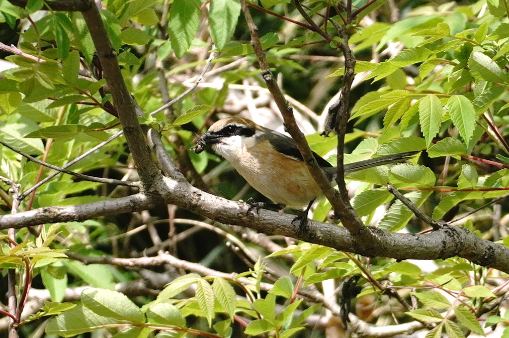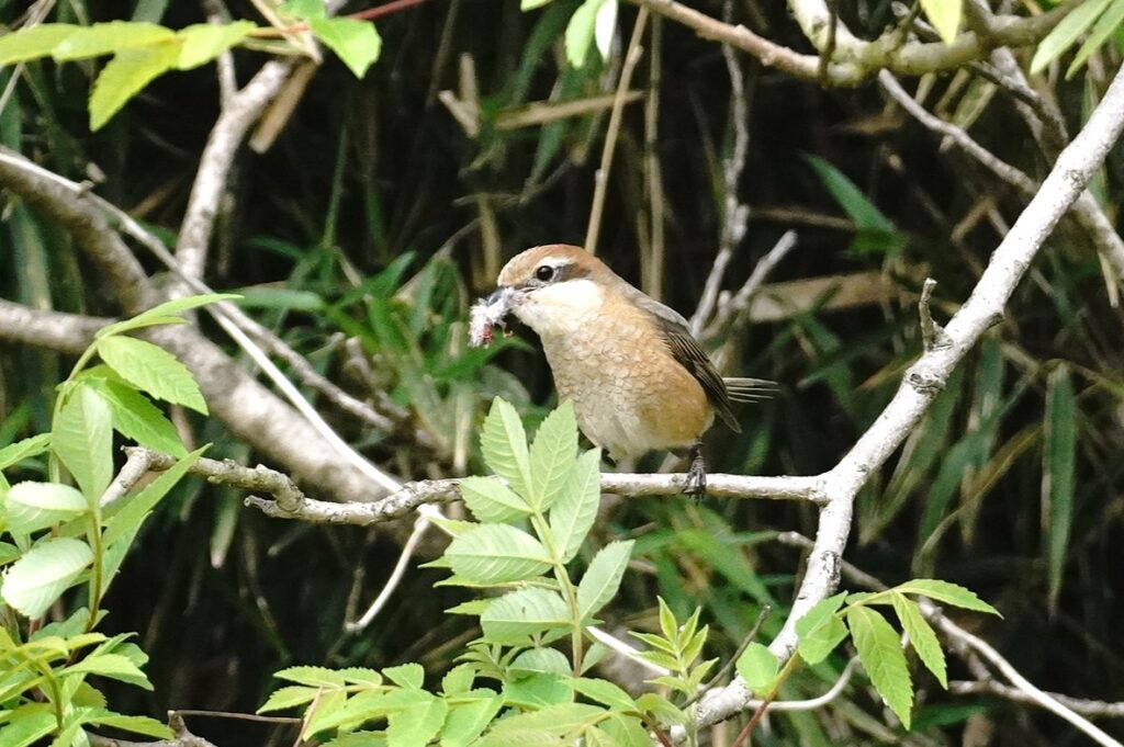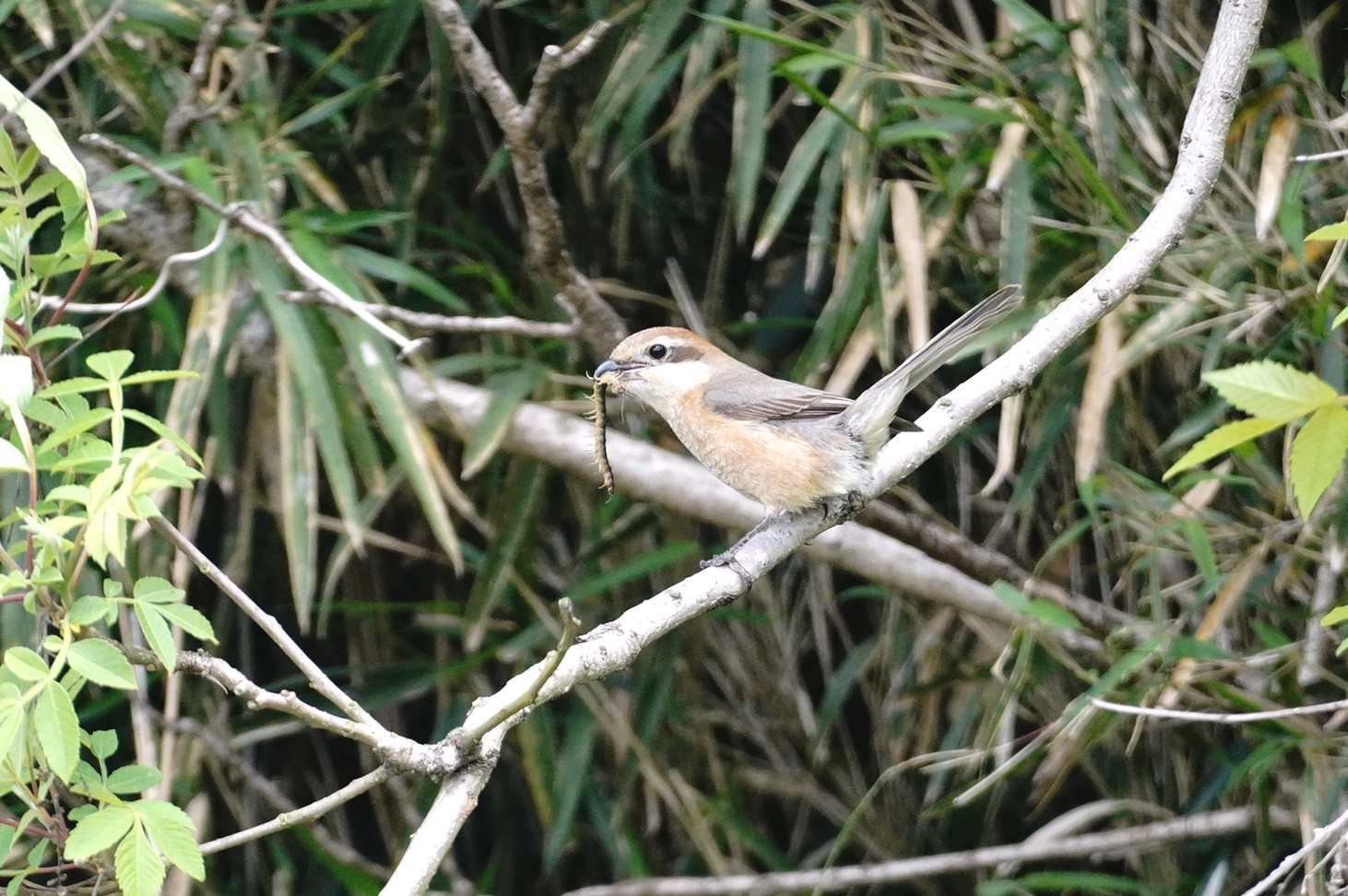 日中になると様々な昆虫が姿を見せ、今季初見のものも多かったです。最近モズを見ないな、昨年の今頃はヒナも出ていたのにと思いながら公園内を歩いていると、モズの大きな声が。モズのメスでした。もしかしてヒナを呼んでいるのかなと、離れた場所で見守ることに。モズ子さんは近くを移動しながら、時には餌になる虫をくわえながら鳴いています。途中他のものも撮ったりしながら、約3時間観察を続けましたが、ヒナの姿はなかったです。その間父モズも3回登場し、やはり餌をくわえて鳴いたりしていました。すぐ横に竹藪があり、餌をくわえてその中に消えて行くことも。ということはその中に巣があり、ヒナの巣立ちを促しているのかなと思いました。それにしてもすごいボリュームでずっと鳴き続けた母モズのスタミナに驚くと同時に、父モズはその1/10以下でした。今後もこのモズさん一家の様子を観察できたらと願っています。