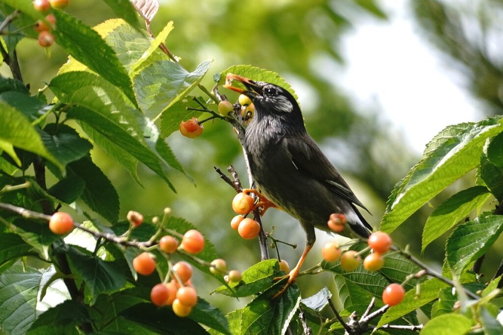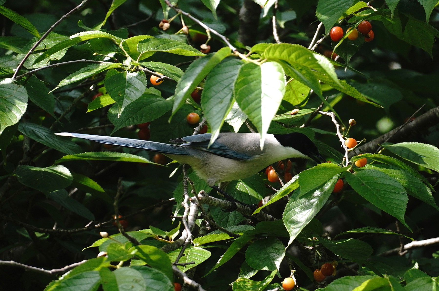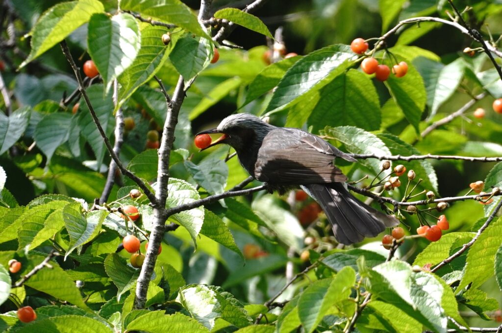 桜の木に赤い実が成っています サクランボですかね そこへ鳥たちがやってきました オナガ
